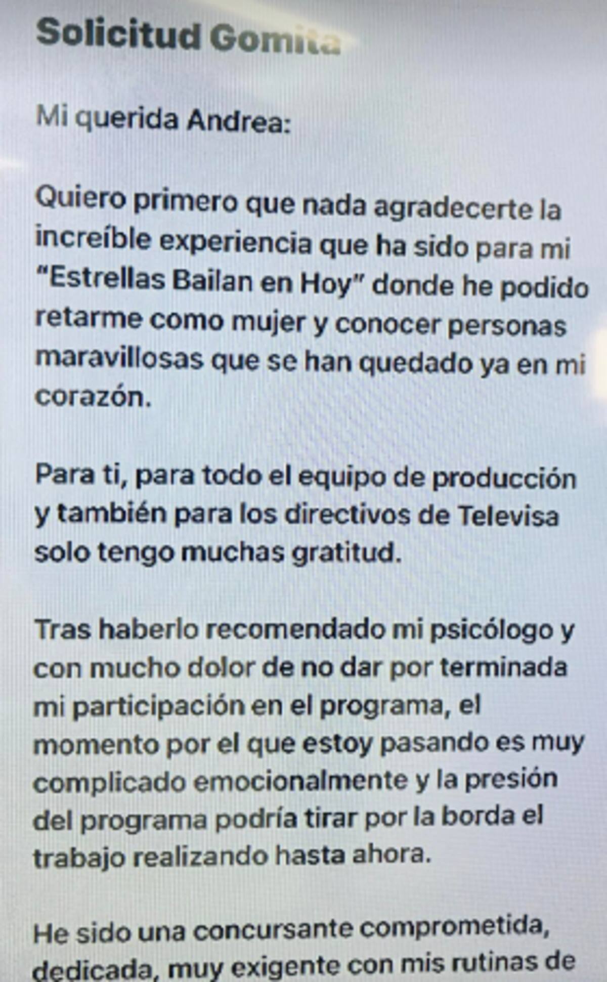 Ha sido una increíble experiencia para mí ´Las estrellas bailan en hoy´, donde he podido retarme como mujer y conocer a personas maravillosas que se han quedado ya en mi corazón. Mi psicólogo me recomendó dar terminada mi presentación en el programa. El momento por el que paso es muy complicado emocionalmente y la presión del programa podría tirar por la borda el trabajo realizado hasta ahora", informó en el comunicado.