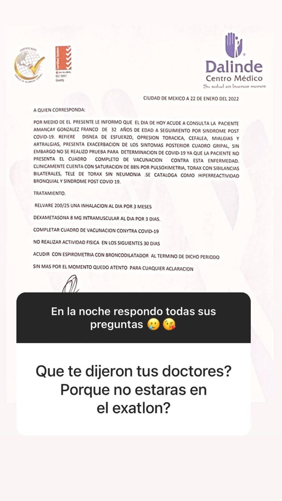 Macky publicó la imagen de un diagnostico médico en el que se mencionó los problemas de salud por los que está pasando la atleta.