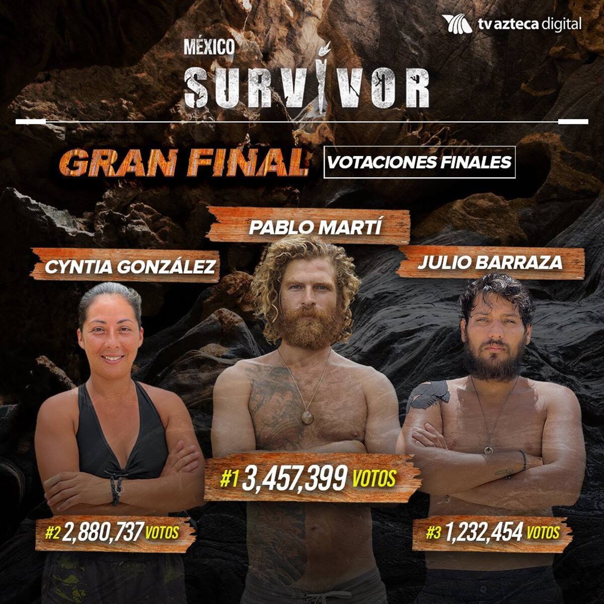 El primer capitán de “Halcones” se ganó dos millones de pesos, luego de que 3, 457, 399 personas votaran por él, dejando en segundo lugar a Cynthia González con 2, 880, 737, y en tercero a Julio Barraza con 1, 232, 454 votos.