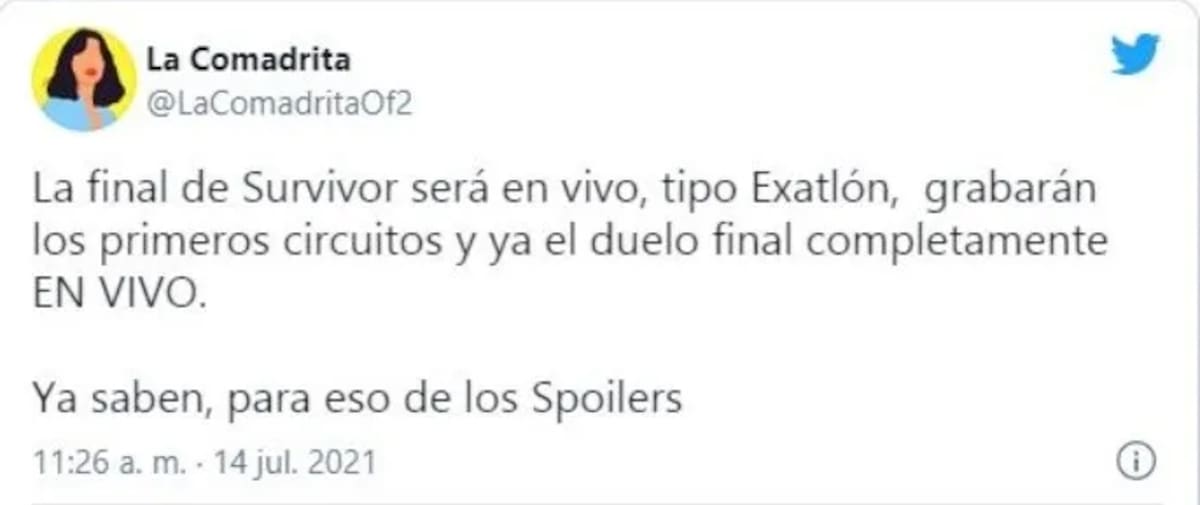 La final de Survivor será en vivo, tipo Exatlón, grabarán los primeros circuitos y ya el duelo final completamente EN VIVO. Ya saben, para eso de los Spoilers.”, aseguró una usuaria de Twitter.