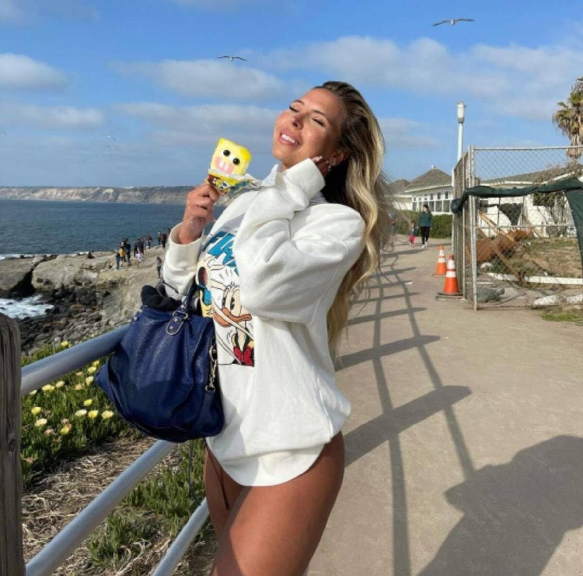 En la primera imagen la brasileña aparece de lado, permitiéndonos apreciar sus marcadas piernas gracias a su increíble traje de baño, en tanto que su rubia cabellera cubre su rostro.