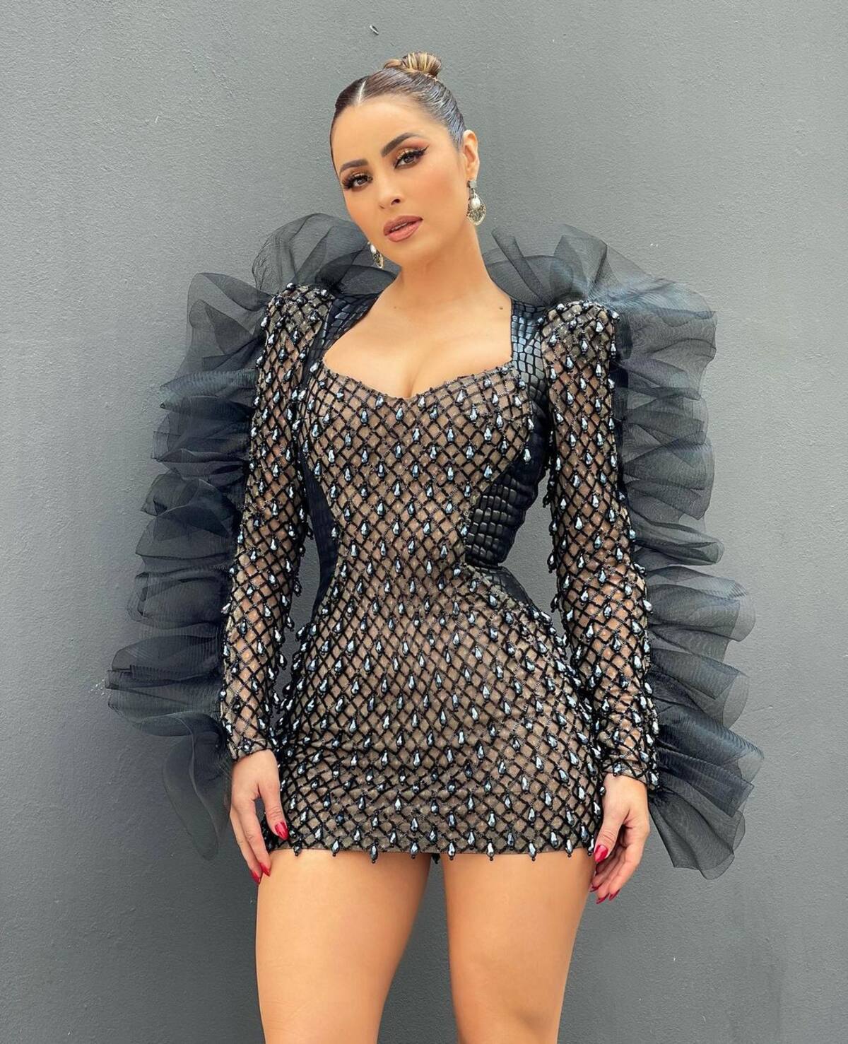 En la imagen se ve a la también cantante posando ante la cámara con un vestido corto de manga larga.