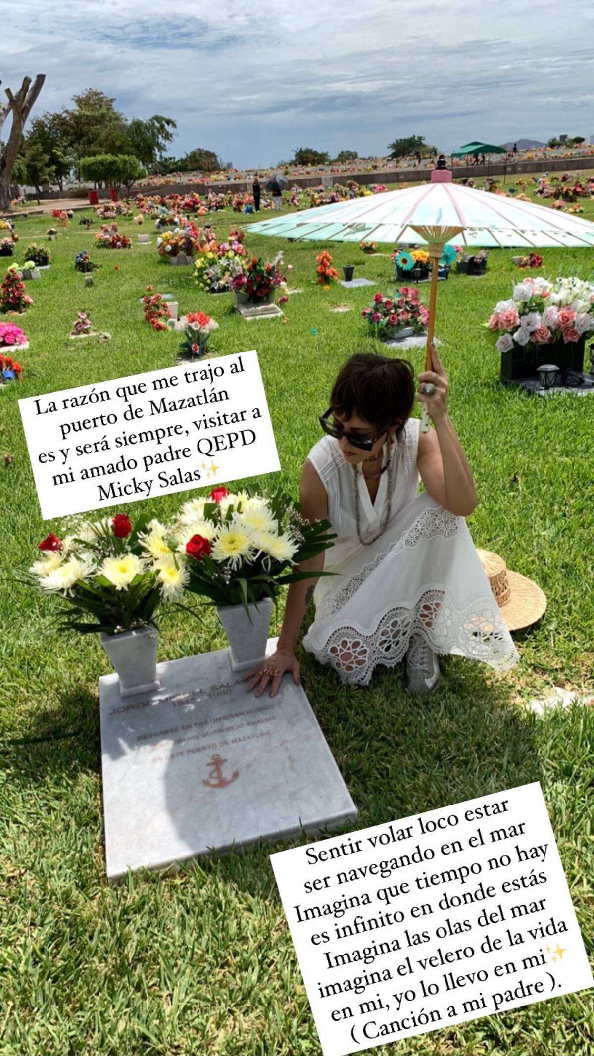 La razón que me trajo al puerto de Mazatlán es y será siempre, visitar a mi amado padre QEPD Micky Salas”, escribió la hija de Sylvia Pasquel junto a una fotografía donde aparece sentada junto a la tumba del músico.