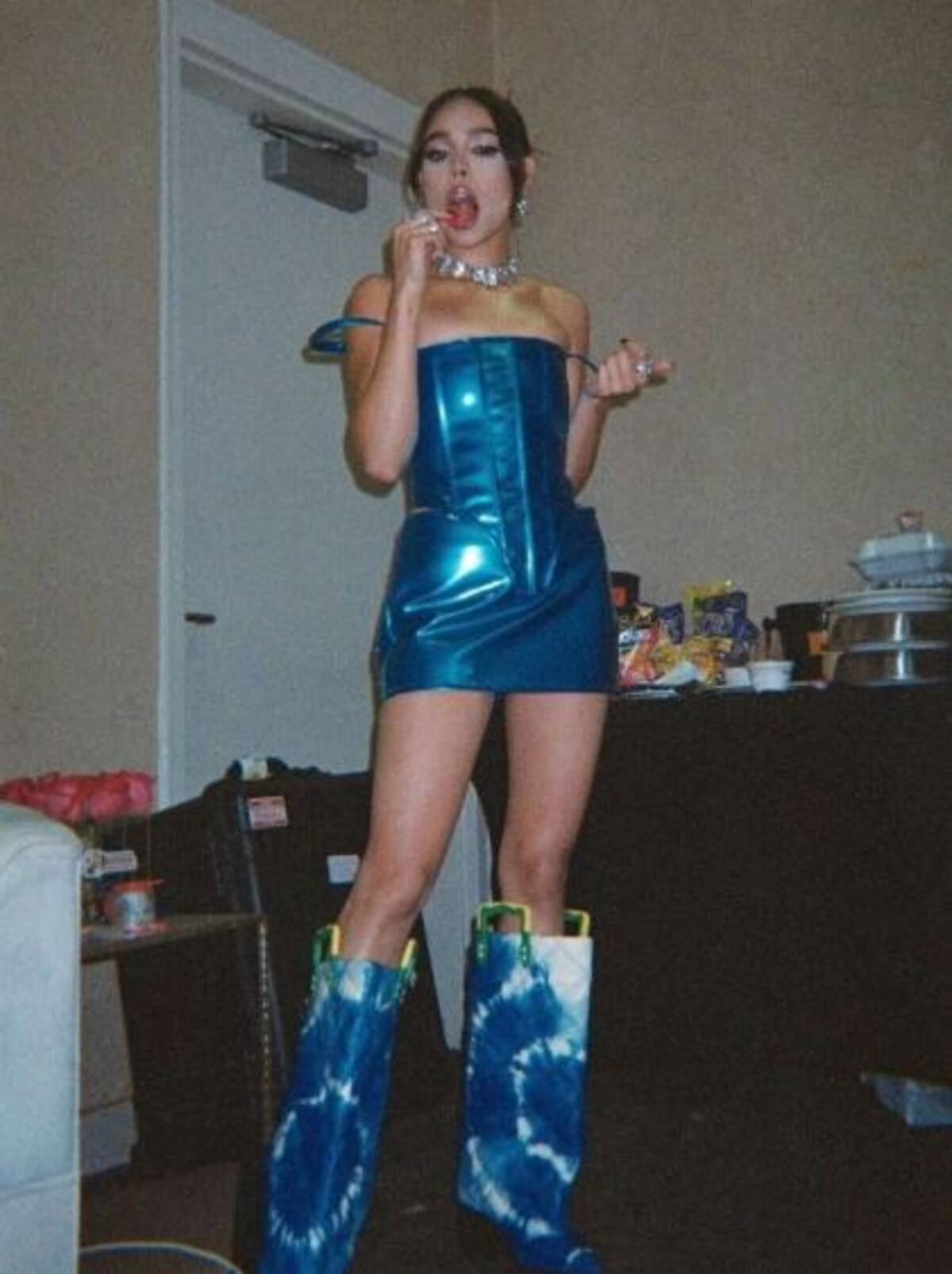 Por último, posó con uno de los vestuarios que utiliza durante sus shows, tratándose de un entallado vestido de látex en color azul, el cual, en la parte superior, parecía tener un corsé, no obstante, lo que acaparó las miradas fueron un par de botas del mismo tono.
