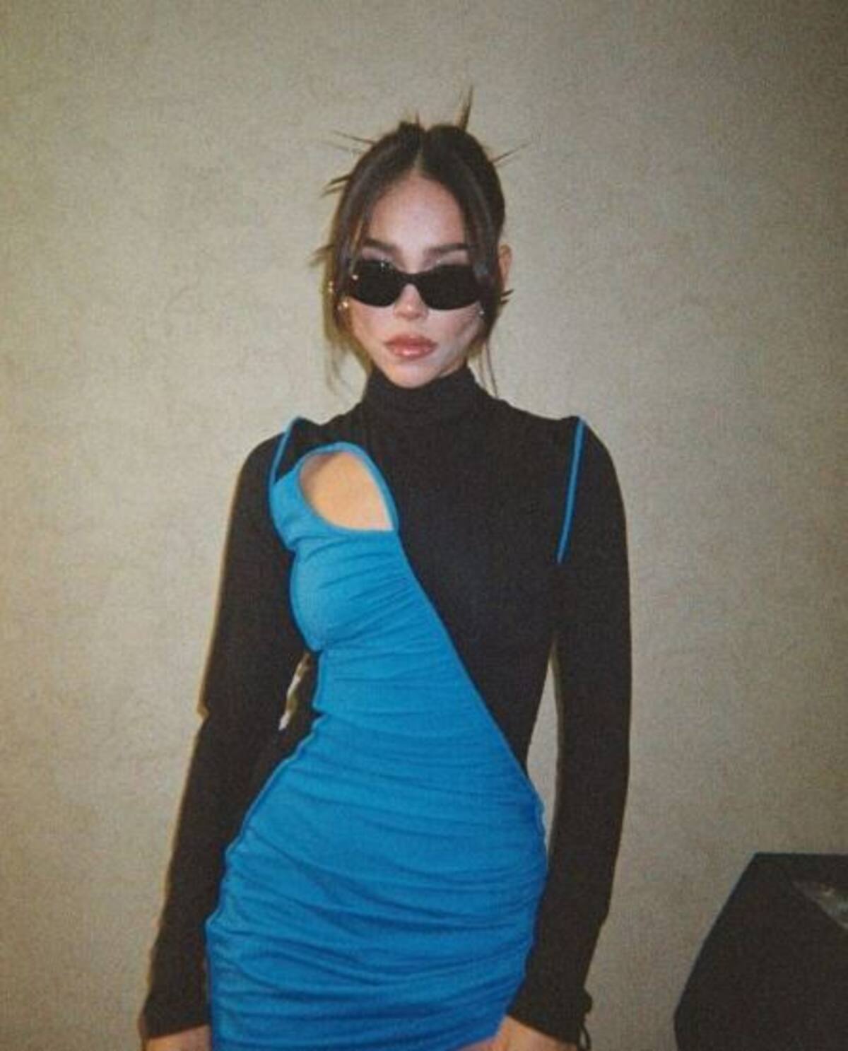 En su primera publicación, la intérprete de “Mala Fama” apareció con un vestido azul con negro, el cual era de estilo japonés y era sumamente corto, además, dicha prenda estaba confeccionada con licra, además, utilizó un par de gafas de sol.