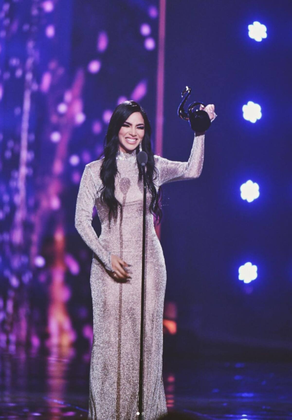 Durante la premiación, Kimberly Loaiza recibió el galardón como artista revelación femenina. Y para hacerse de su premio, la artista destacó un segundo look con un vestido ajustado de textura brillante, manga larga y cuello alto, que resplandeció junto con ella al recibir su reconocimiento.