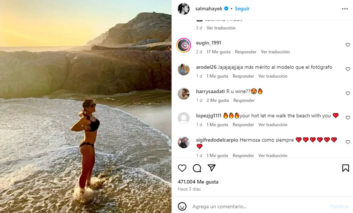 La fotografía, que ha acumulado más de 471 mil “Me gusta” hasta el momento, muestra a Salma Hayek disfrutando de las cálidas aguas marinas con un traje de baño de dos piezas que resalta sus curvas envidiables a sus 57 años. La actriz complementó su outfit con impactantes lentes de sol y un sencillo peinado de cola de caballo, recibiendo elogios por su estilo único y su forma de posar original.