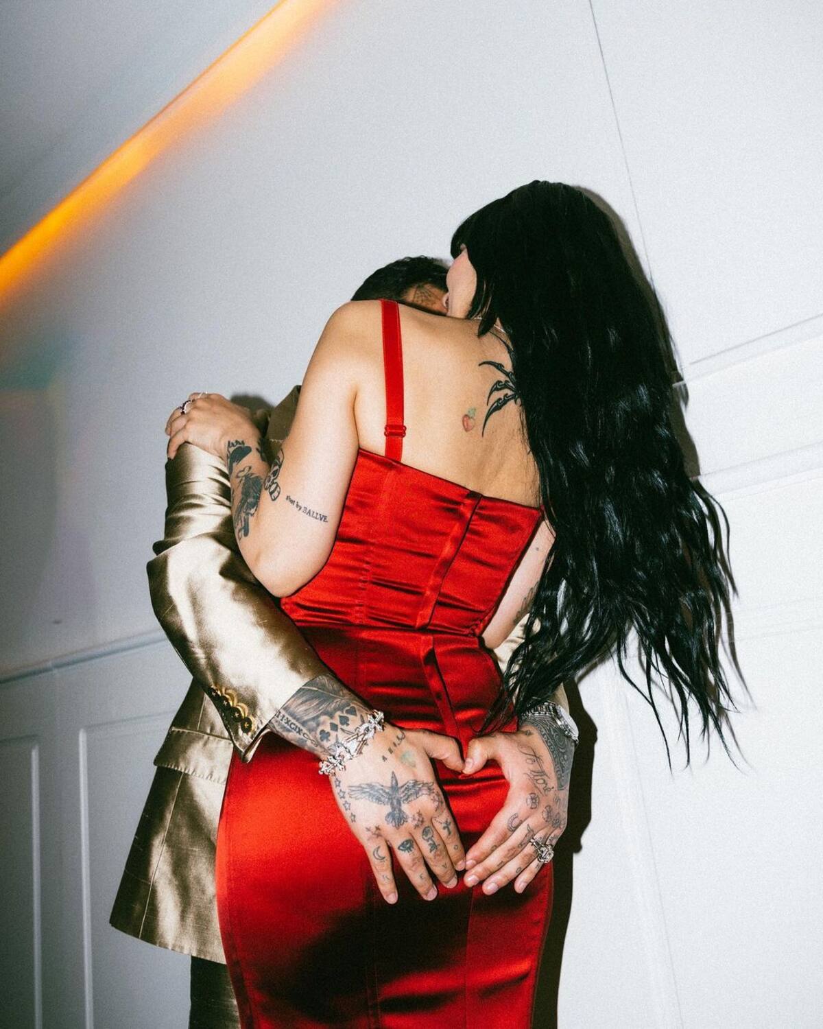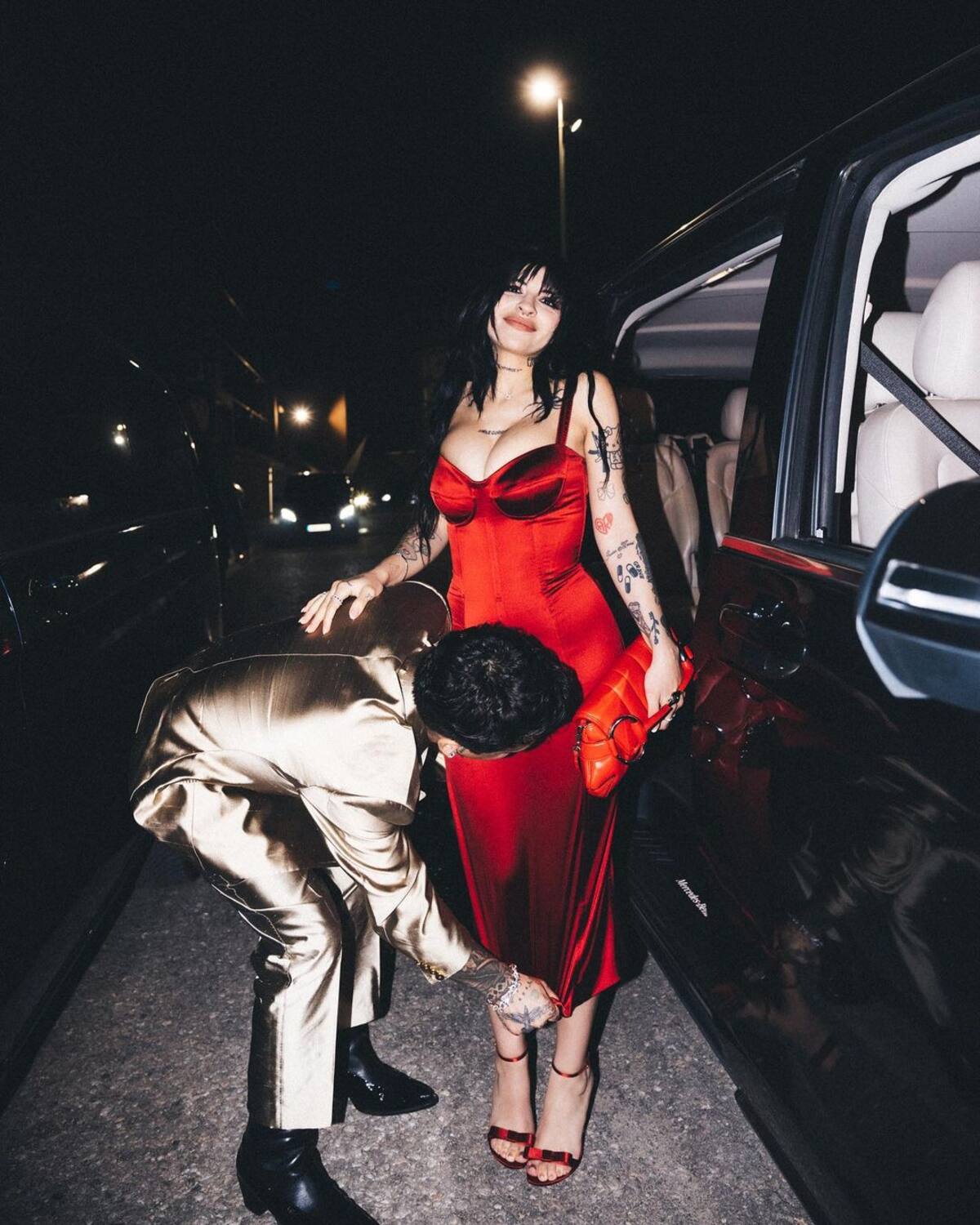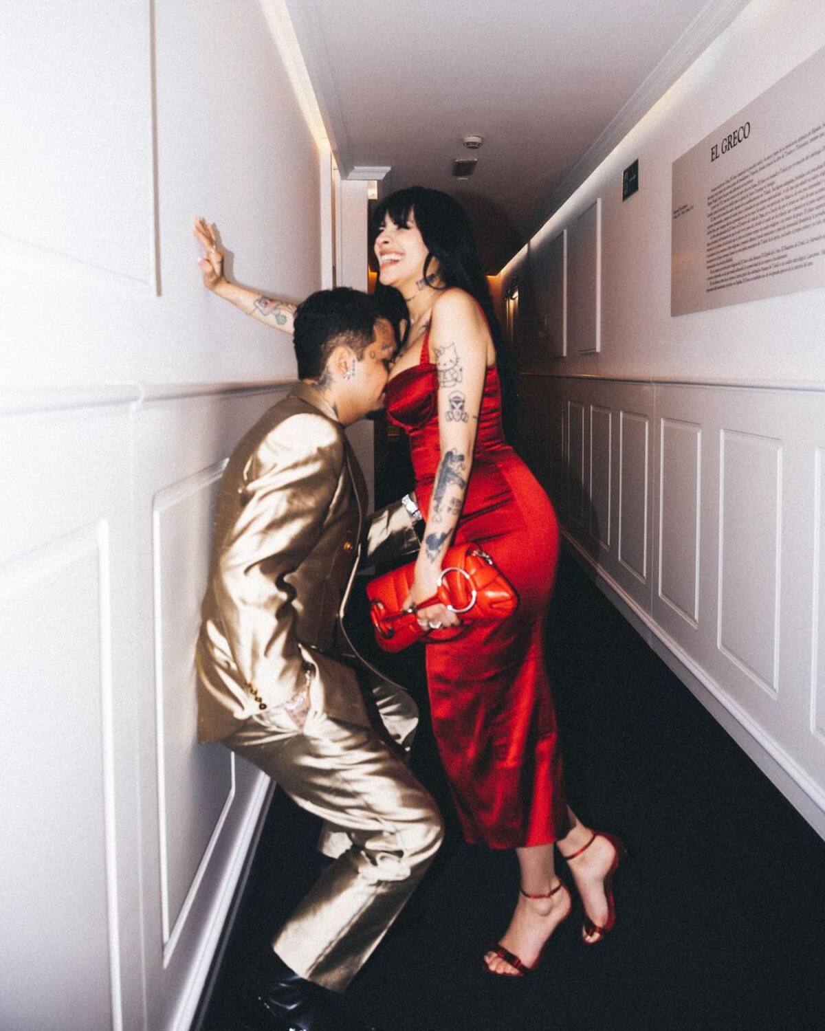 Por su parte, el intérprete de regional mexicano decidió lucir un traje dorado estilo satín y botas cafés. En cuanto a Cazzu, deslumbró a todos con un sencillo, pero sensual vestido rojo ceñido al cuerpo con el que resaltó sus atributos, y sin duda, Christian fue el primero en notarlo.