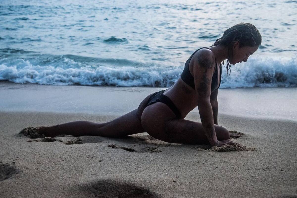 En la imagen se observa a la ex pareja de Luisito Comunica sentada en la orilla del mar viendo a la cámara, mientras se cubre del Sol con una de sus manos y algunas gotas del mar recorren su cuerpo.