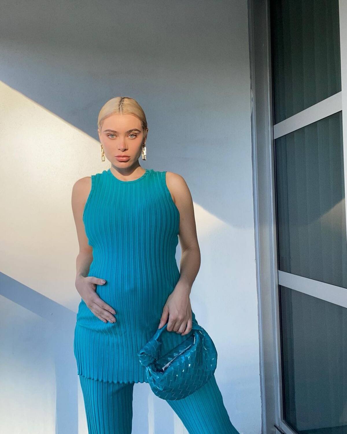 Para esta sesión de fotos, Amara Maple- nombre real de la famosa- vistió un conjunto de pantalón y blusa en color azul, atuendo que combinó con un bolso del mismo color.