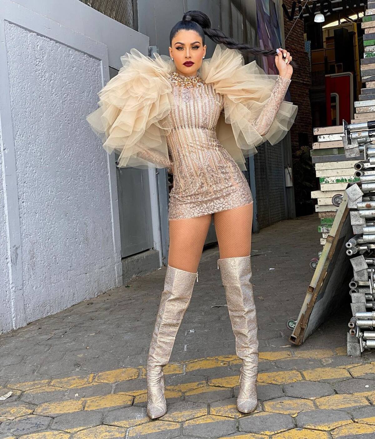 La esposa del empresario Luis Ángel Garza acompañó su outfit con medias de red y botas altas. Además utilizó un maquillaje con el que remarcó su rostro y una coleta.