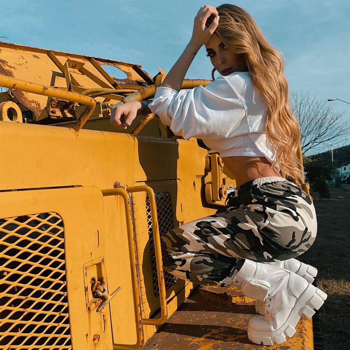 En la imagen aparece Camy G con un conjunto de ropa interior negro, atuendo que combinó con cadenas y una chamarra top con estampado de dólar.