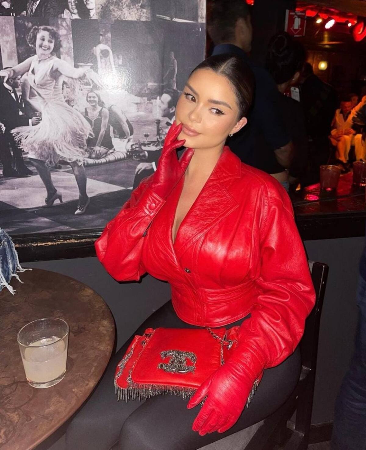 En la primera imagen la modelo aparece sentada en la mesa de un restaurante, mirando fijamente a la cámara a través de sus lentes, tocando su boca con uno de sus dedos.