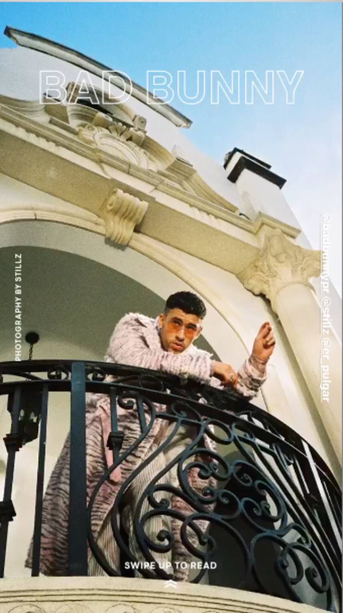 En la primera foto se observa a Bad Bunny recargado sobre un barandal en una terraza, mientras usa una gabardina de cebra, con unos pantalones.