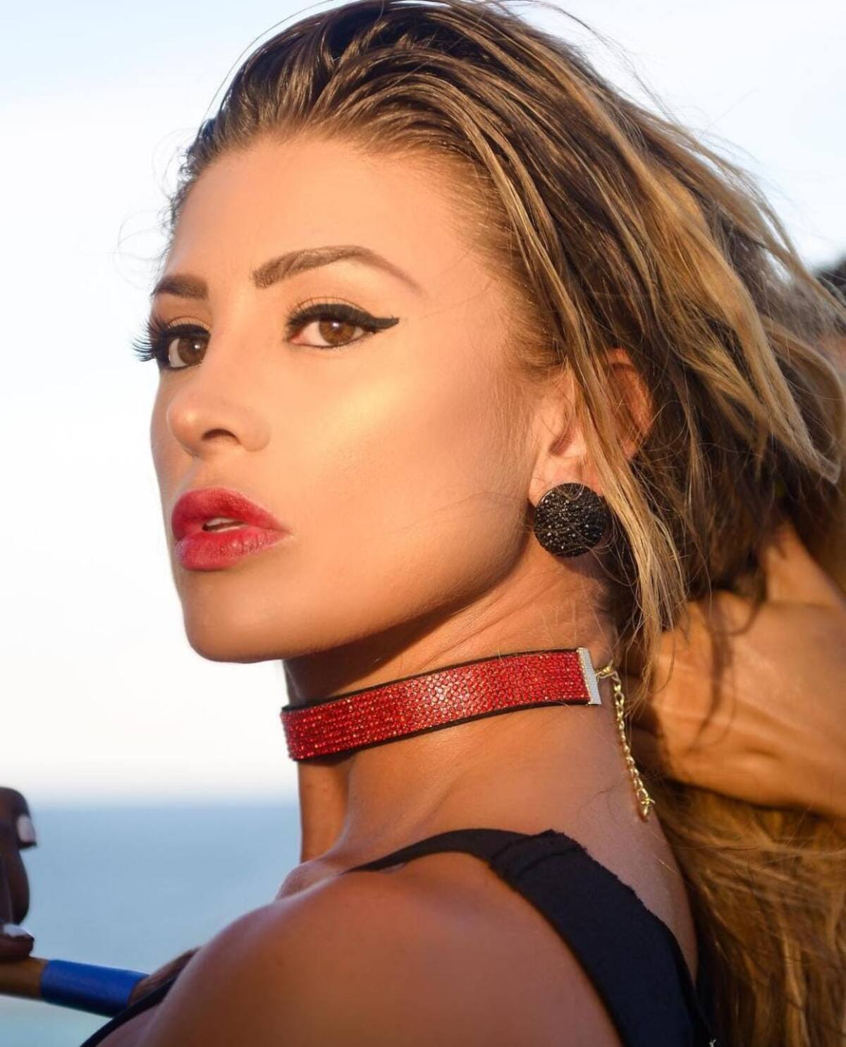 Dentro de la primera imagen la modelo se encuentra sentada, mientras lleva puesto su pequeño y ajustado bañador negro, resaltando a la perfección sus grandes encantos.