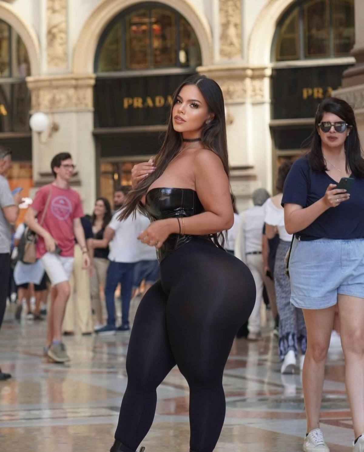 En la primera imagen la modelo aparece de lado, dejando al descubierto su impresionante figura, bellamente acentuada por su llamativo atuendo.