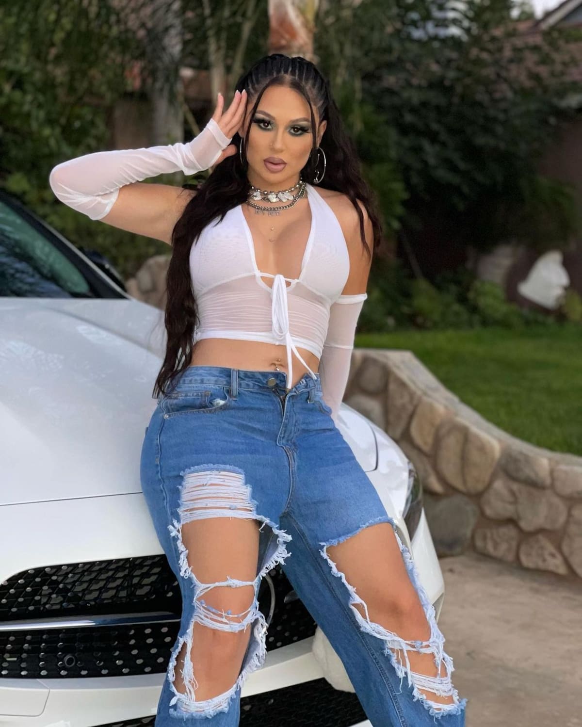 Para esta foto, Jenny 69 usó un maquillaje con el que remarcó su rostro y una peluca en color naraja. También utilizó aretes grandes en color plateado.