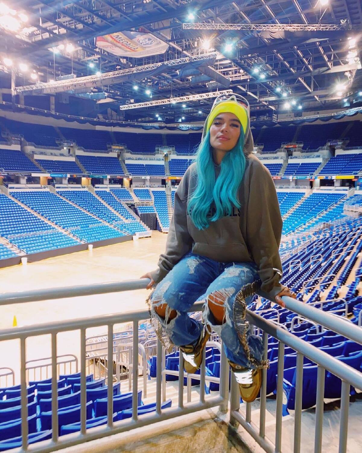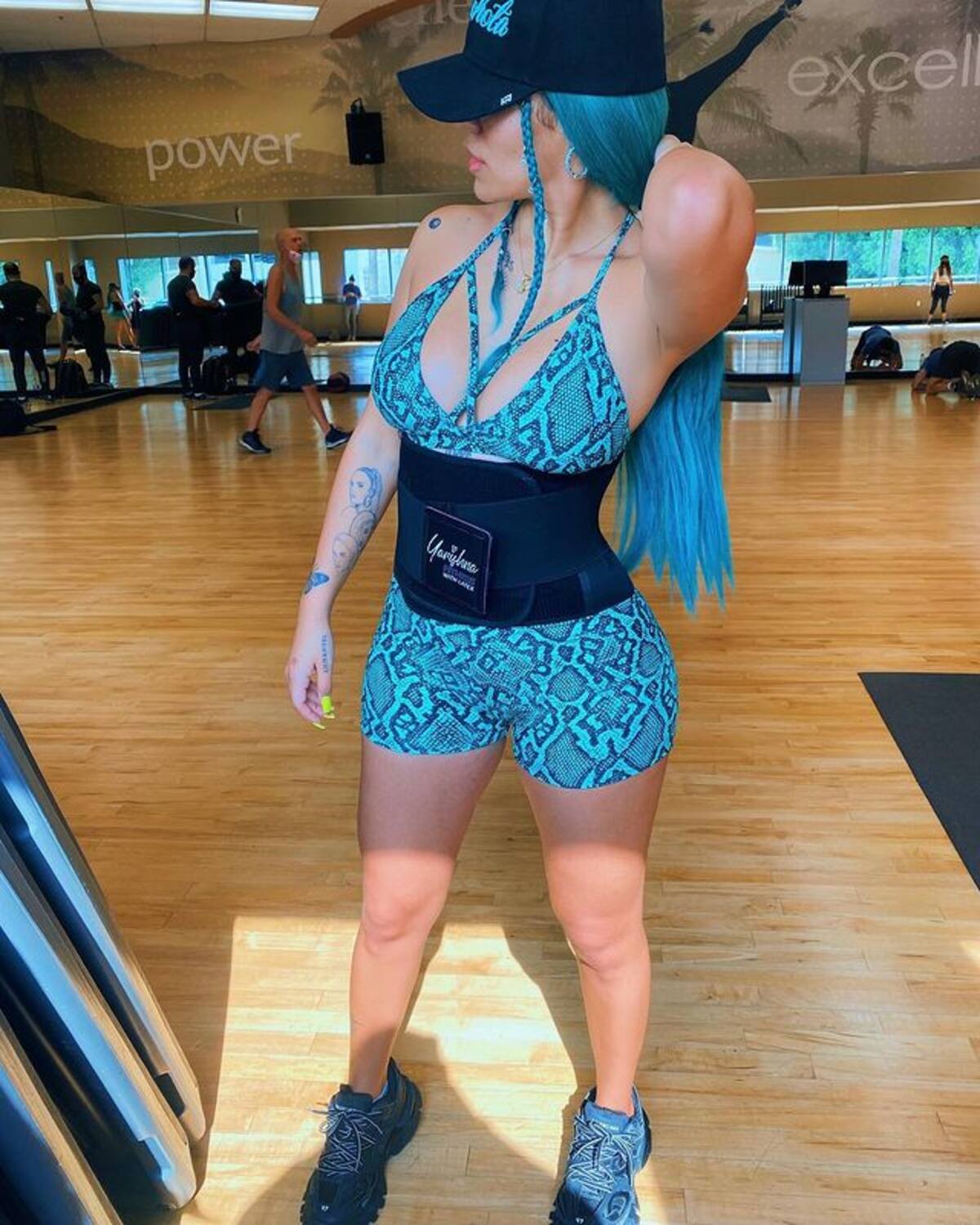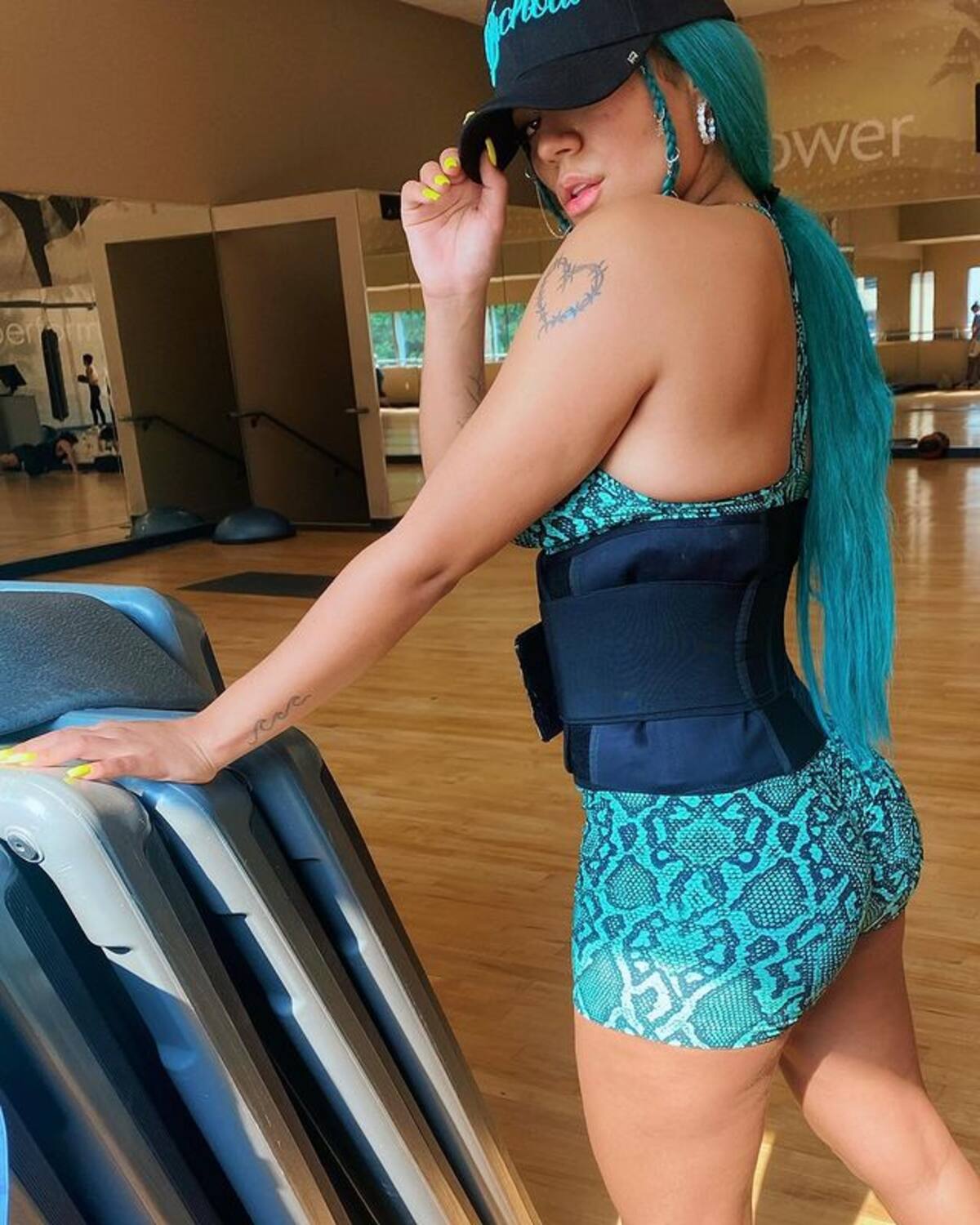 En las fotos se ve a Karol G luciendo su figura con un conjunto deportivo con estampado de víbora en color azul cielo, su color favorito.