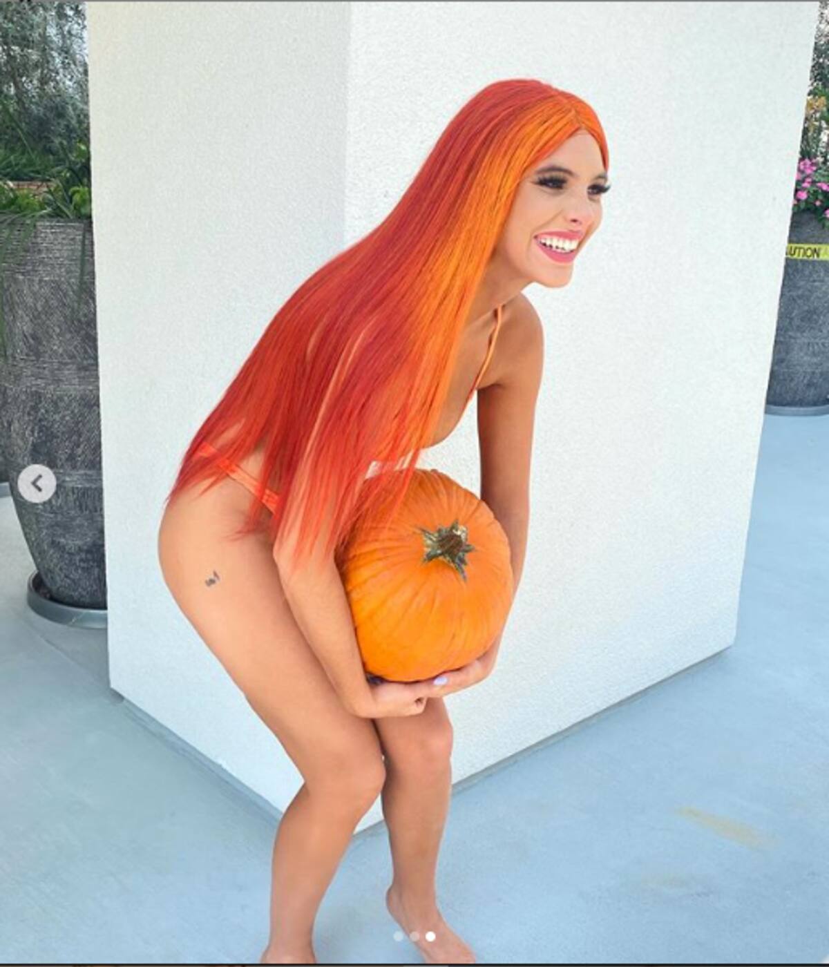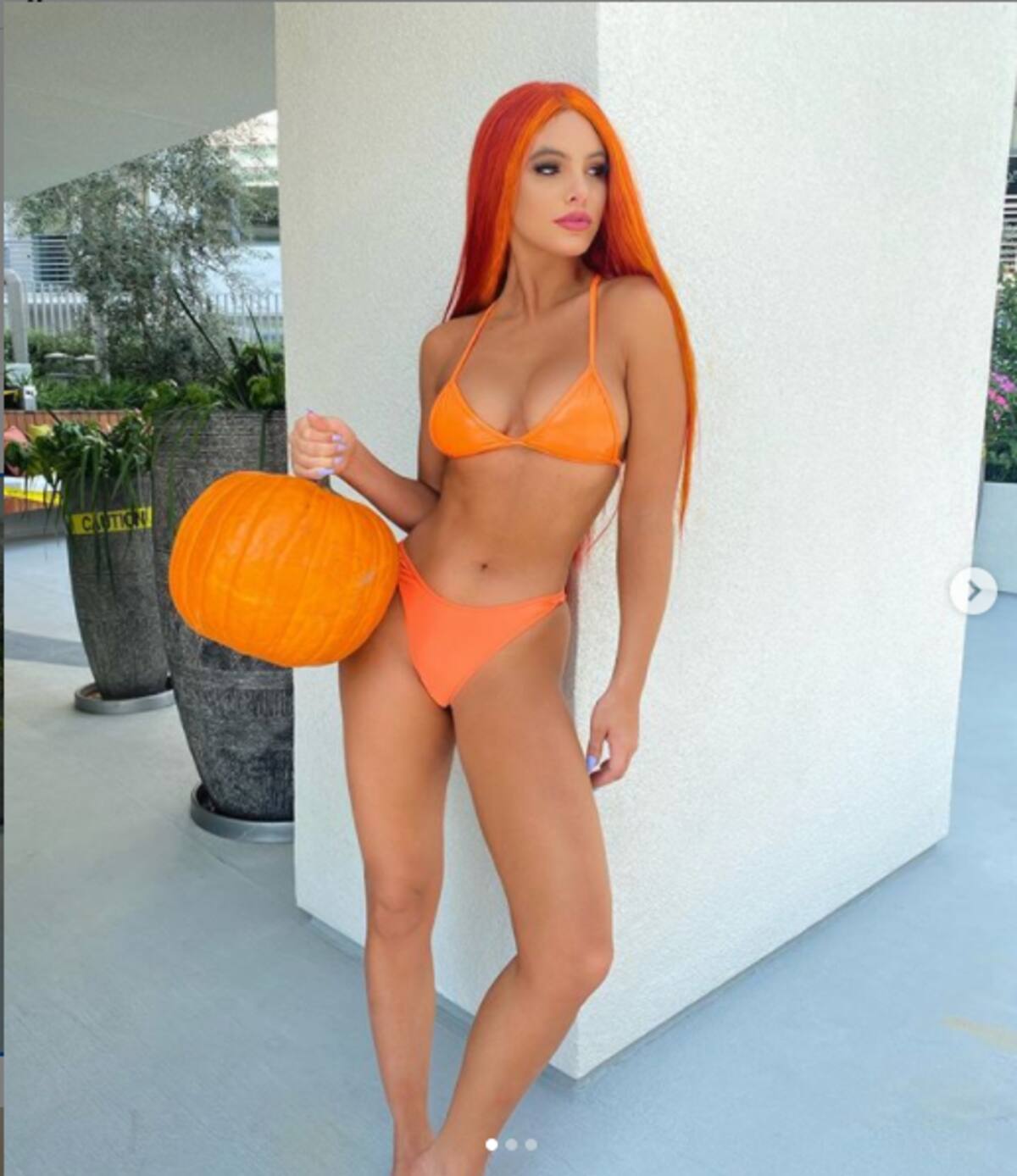 La intérprete de "Se te Nota", posó al lado de una calabaza, vestida solo con un diminuto traje de baño naranja, haciéndola lucir espectacular.