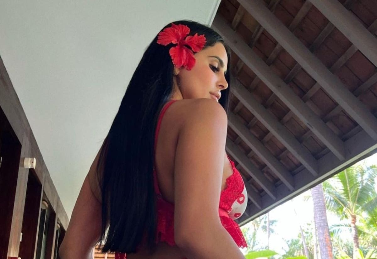 En la primera imagen la modelo aparece en frente de la cámara y dando las espalda, dejando al descubierto su espectacular retaguardia, colocando las manos justo en sus muslos.