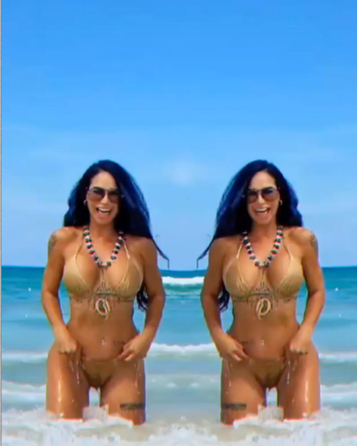 En las fotografías que compartió en su perfil se puede ver a la cubana de 42 años plenamente feliz con un traje de baño dorado y unas gafas de sol, mientras corre entre las olas y mueve su cabellera negra.