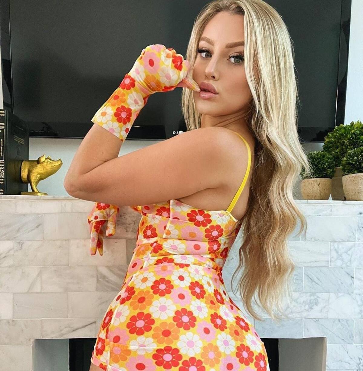 Finalmente la estadounidense se muestra de espaldas, dejando al descubierto su gran retaguardia, mientras su larga cabellera rubia cae por su espalda.