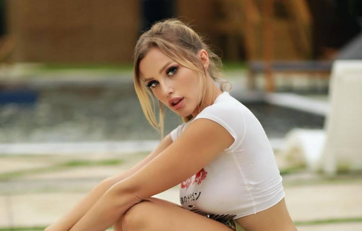 En la primera imagen la modelo aparece tirando un beso, dejando al descubierto sus grandes encantos, bellamente acentuados por su bikini.