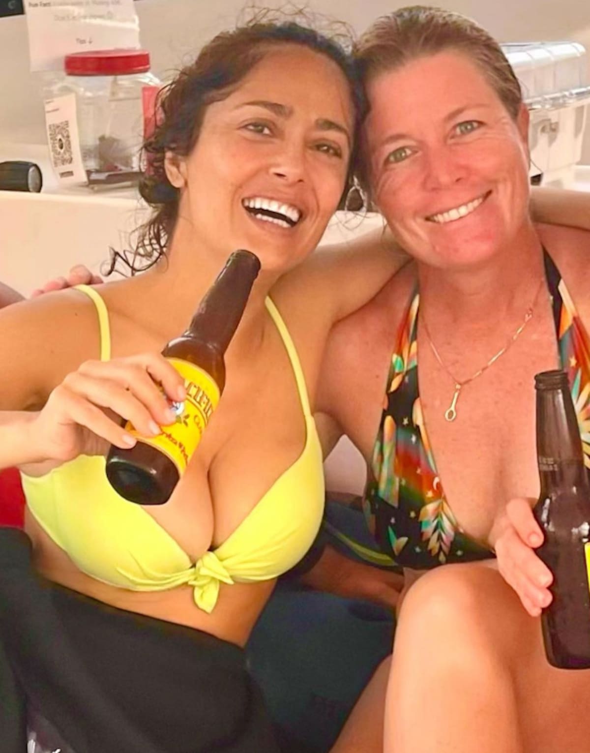 A sus 56 años, Salma presumió su espectacular figura curvilínea mientras abrazaba cariñosamente a su instructora de buceo, Martina Engel, con quien compartió un grato momento después de su inmersión, disfrutando de unas cervezas, tal como mostró en su cuenta de Instagram.