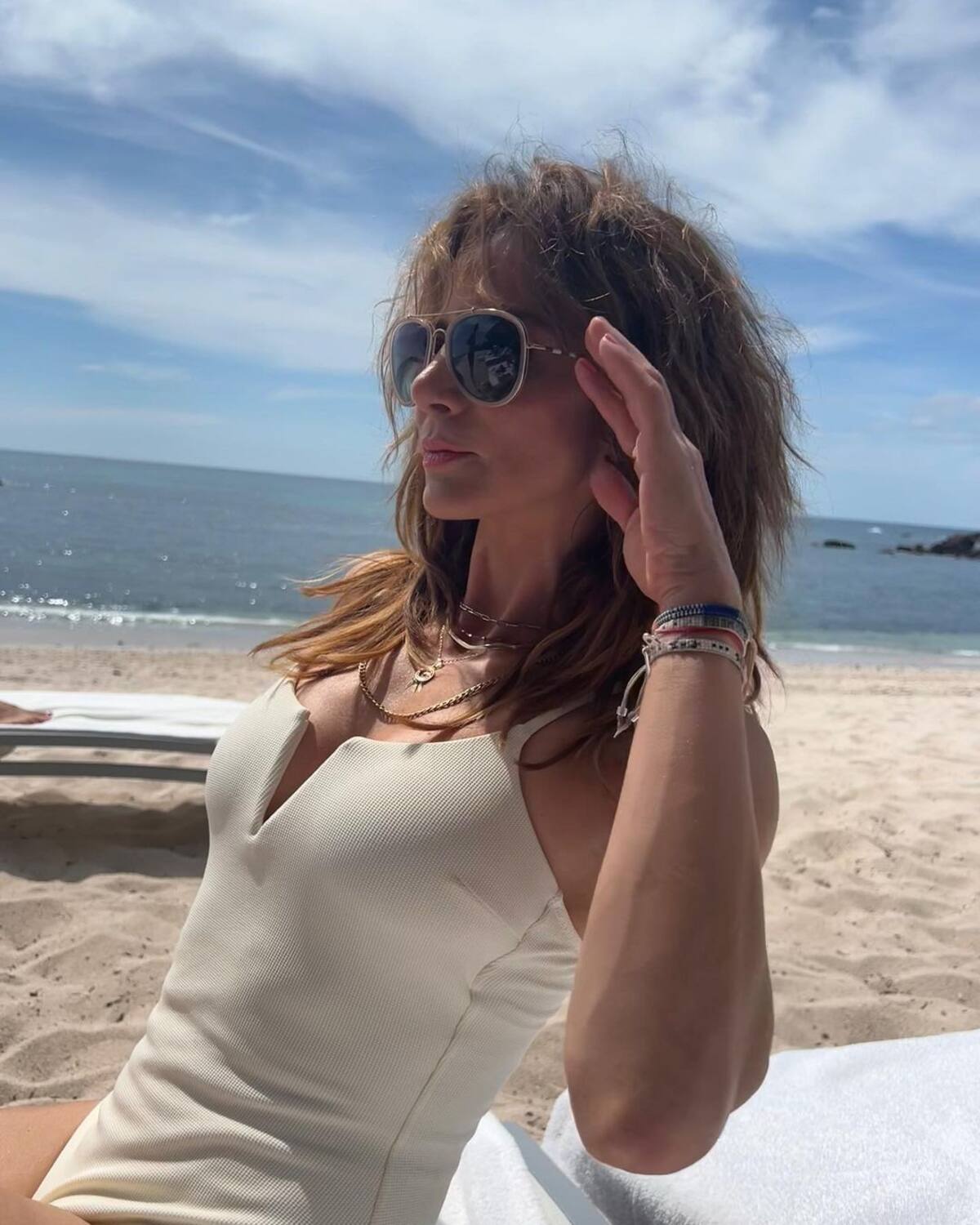 A través de su cuenta de Instagram, la guapa actriz de 43 años publicó la foto en donde aparece vistiendo un bikini completo en color blanco que combinó con diversos accesorios como cadenas y pulseras y unas gafas de sol.