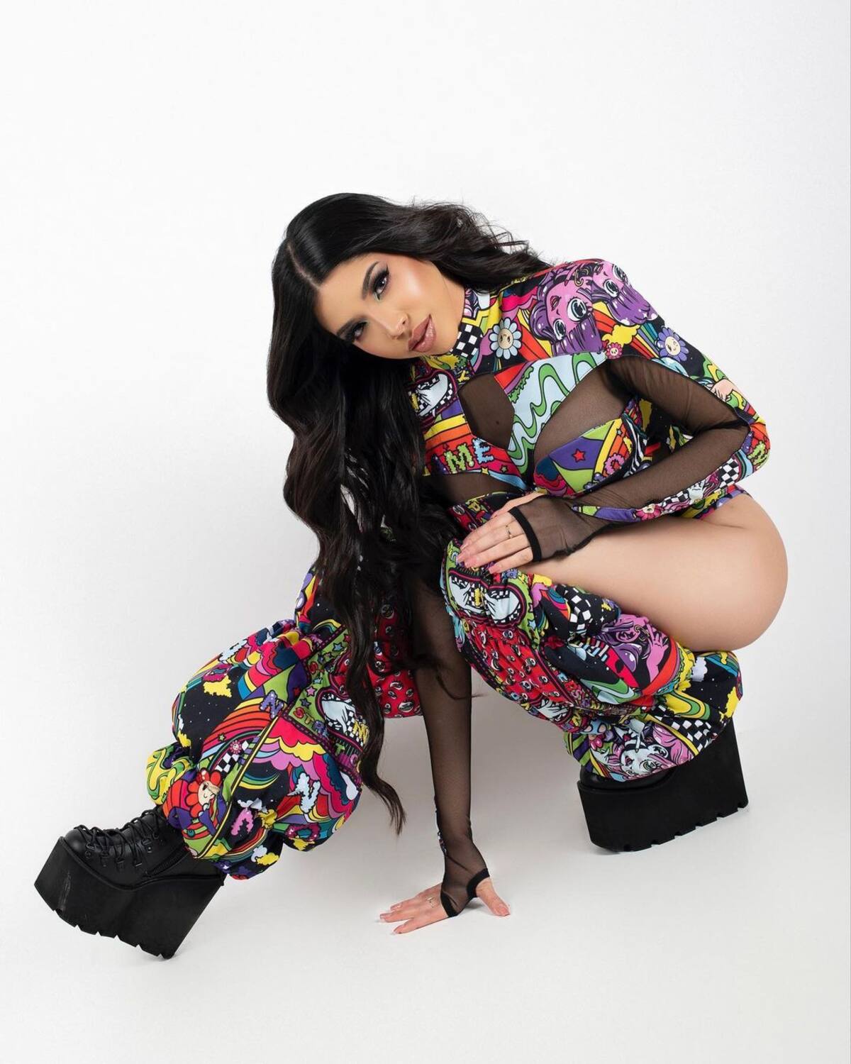 La creadora de contenido de 22 años publicó una atractiva fotografía en donde aparece mostrando su “tuneada” figura con un body de colores, el cual combinó con zapatos altos.