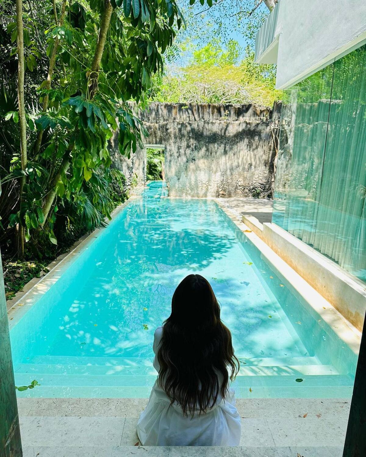 En algunas imágenes que la modelo de 33 años compartió en su perfil se ve luciendo su cuerpazo con diferentes trajes de baño en color negro y azul cielo en el hotel de Chablé, Yucatán.