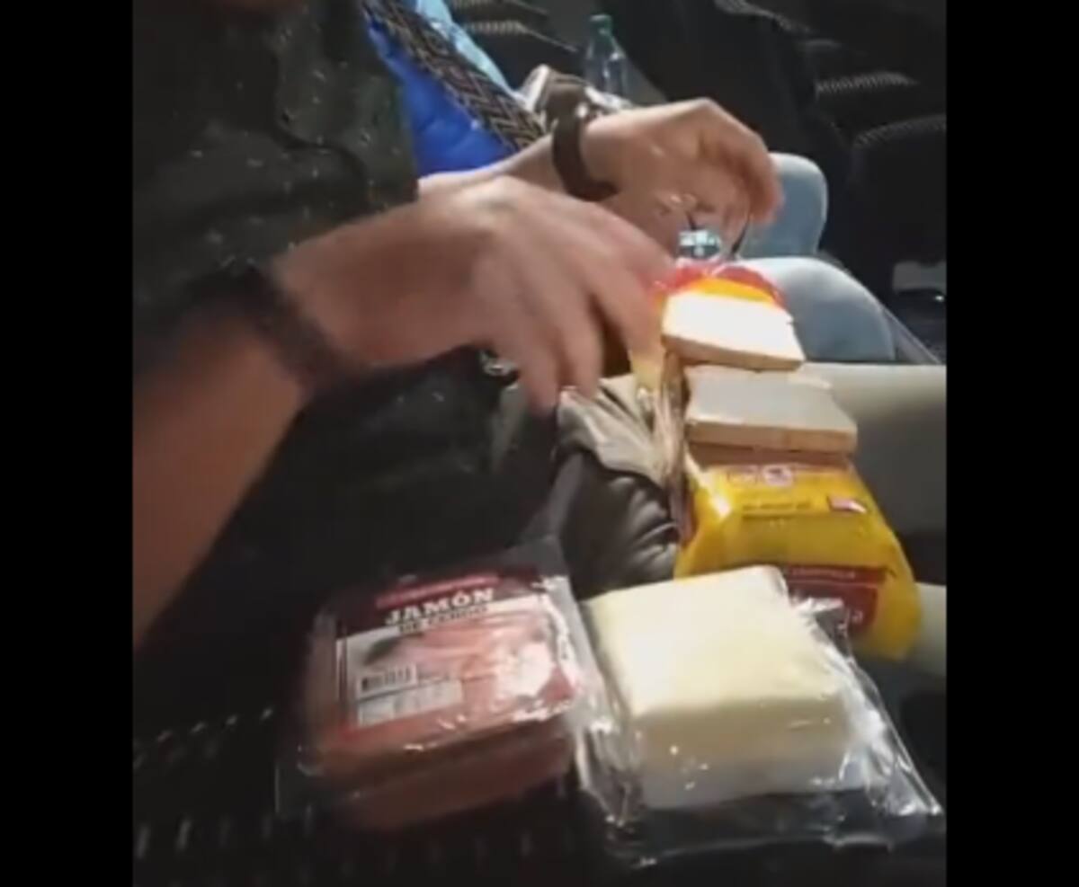 De acuerdo a lo que se aprecia en las imágenes, el joven saca dos panes, los pone encima de sus piernas y tras ello abre una envoltura de queso y jamón para armar su sándwich.