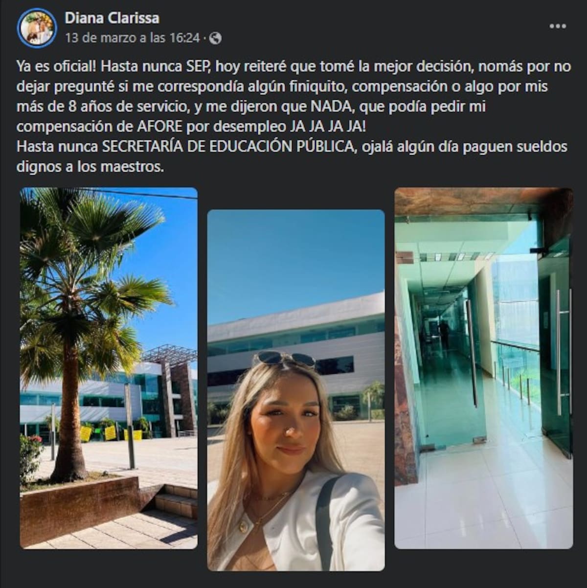 ¡Ya es oficial! Hasta nunca SEP, hoy reiteré que tomé la mejor decisión, nomás por no dejar pregunté si me correspondía algún finiquito, compensación o algo por mis más de 8 años de servicio, y me dijeron que nada, que podía pedir mi compensación de AFORE por desempleo ¡ja, ja, ja!”, escribió la usuario en su cuenta de Facebook.