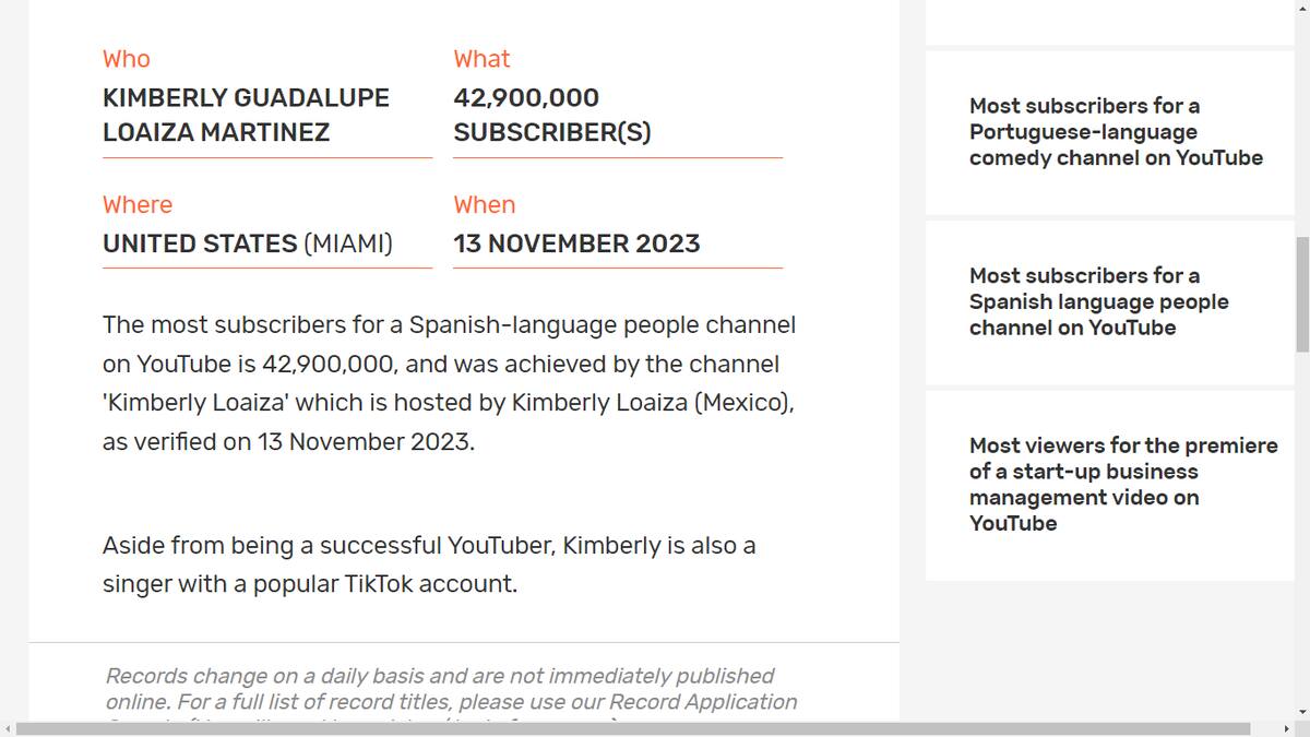 Kimberly compartió su emoción en Instagram con un post que incluía imágenes del certificado de Guinness World Records. En el mensaje, agradeció a sus seguidores por convertir su canal en un récord mundial y expresó su amor hacia su audiencia.