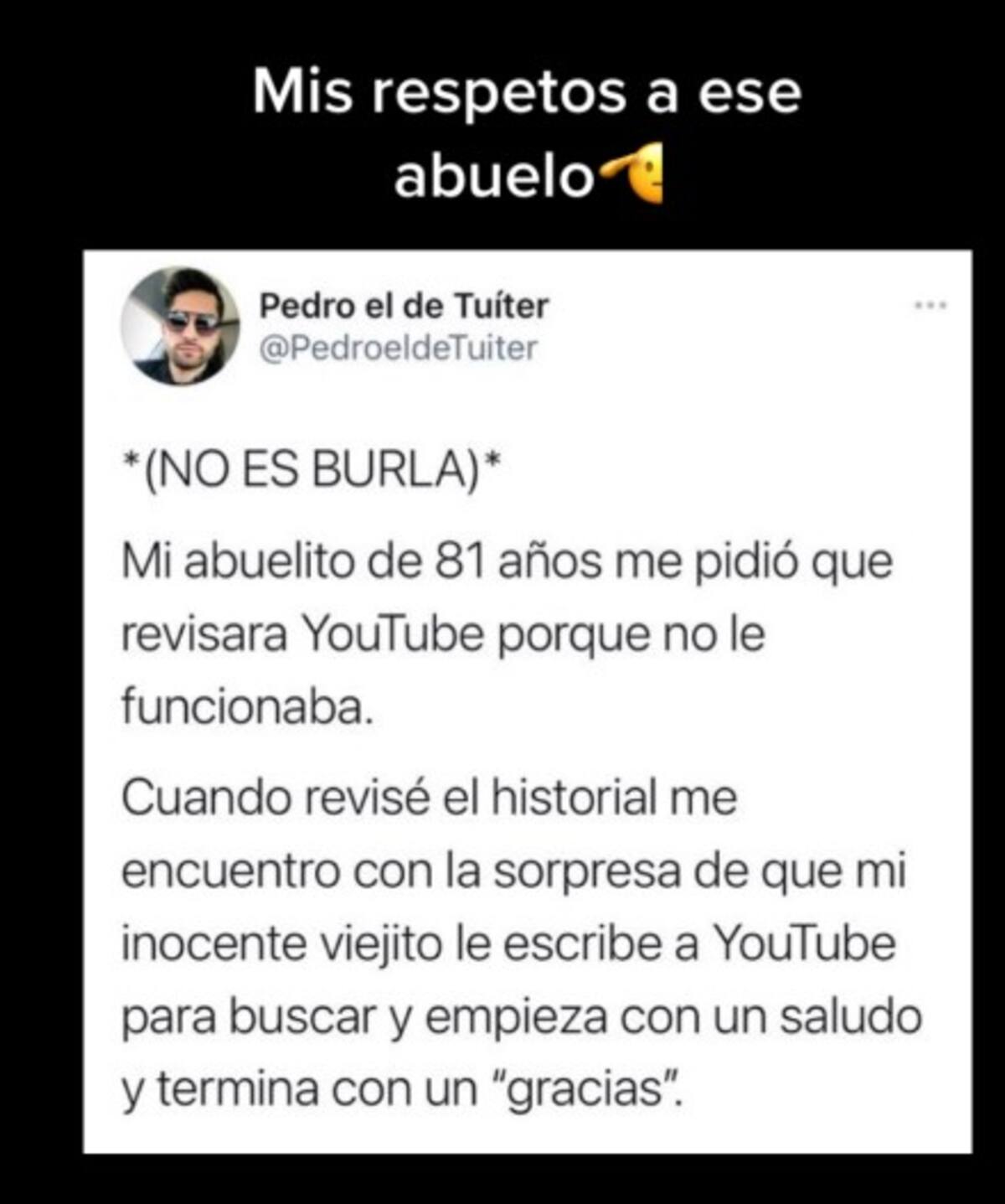 El internauta “@Pedroeldetuiter” compartió que su abuelito de 81 años le pidió que revisará la aplicación de videos porque no le funcionaba y al momento de examinarlo encontró que el señor hacía búsquedas pidiéndolas por favor.