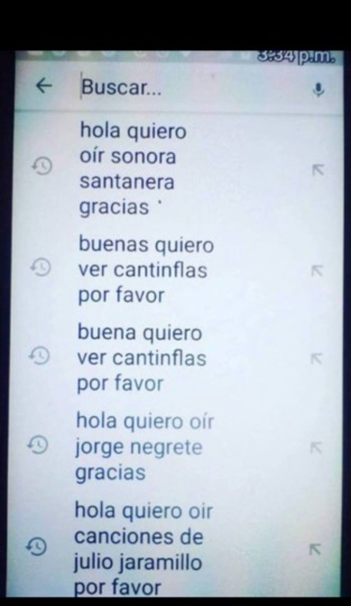 Ante lo mencionado, el joven compartió una fotografía de las búsquedas que hacía su abuelo en donde se podía leer: “Hola, quiero oír la Sonora Santanera, gracias”; “Buenas, quiero ver Cantinflas por favor”; “Hola, quiero oír Jorge Negrete”; y “¡Hola, quiero oír canciones de Julia Jaramillo por favor”.