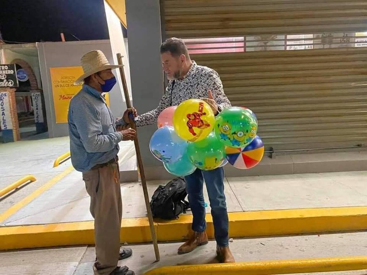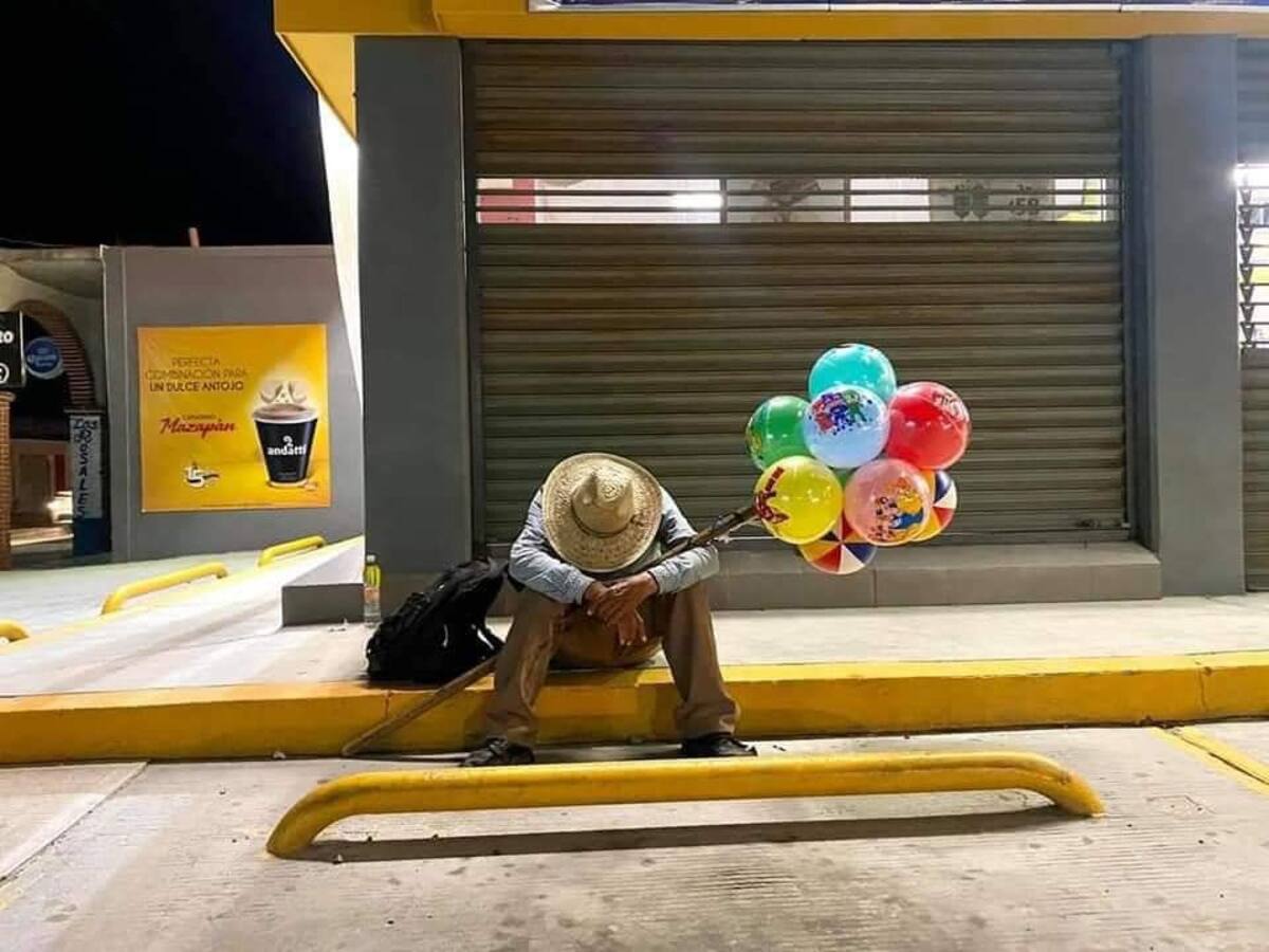 Las imágenes compartidas en la página de Facebook "Conecta MX", muestra a un señor de la tercera edad muy triste sentado afuera de una tienda de conveniencia, mientras carga sus globos, a la espera de que alguna persona le compre alguno.