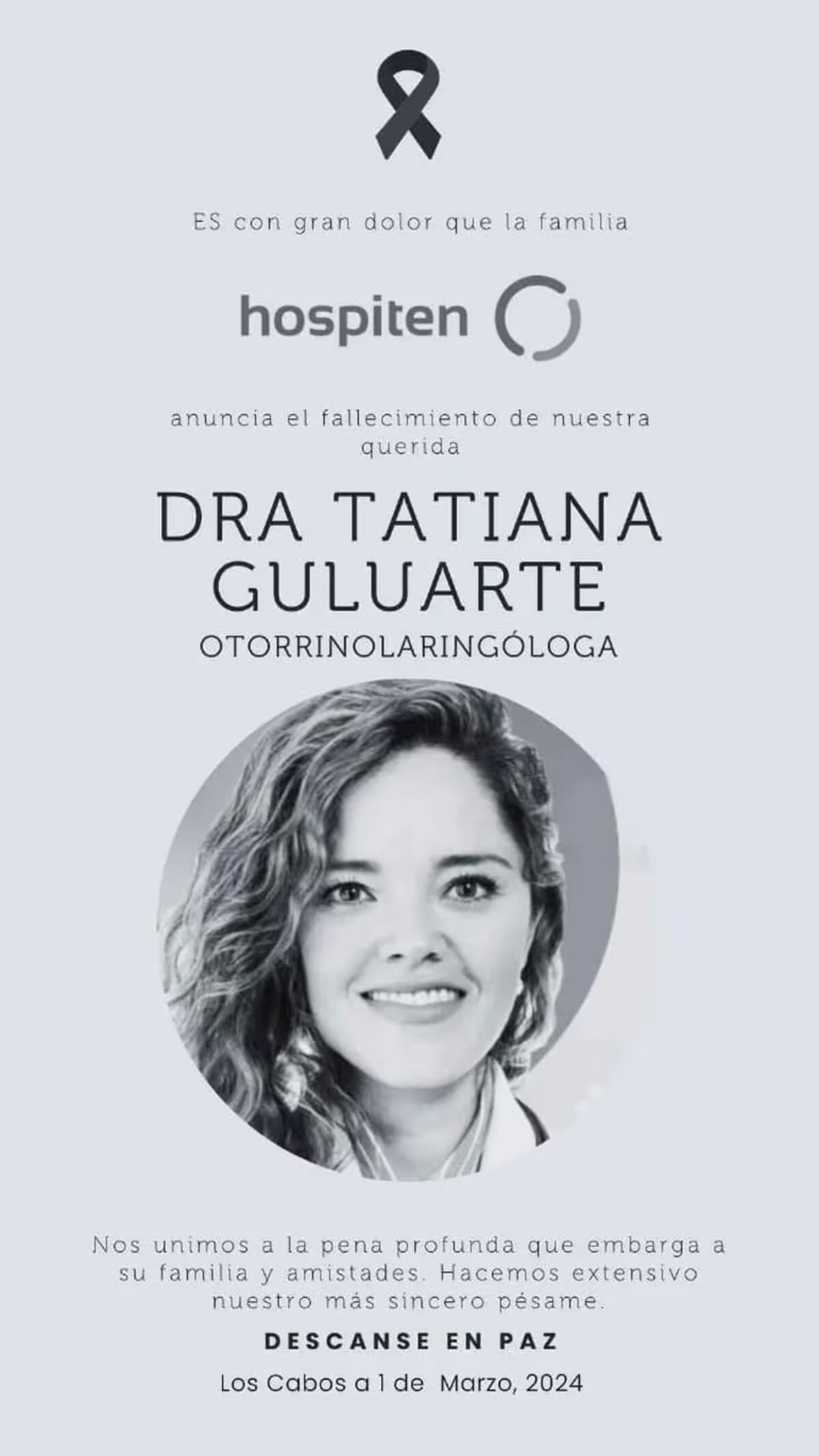 BAJA CALIFORNIA.- A principios del mes de marzo, se dio a conocer la trágica noticia del fallecimiento de la médica Tatiana Guluarte, otorrinolaringóloga del Hospital Hospiten de Los Cabos, en Baja California Sur.