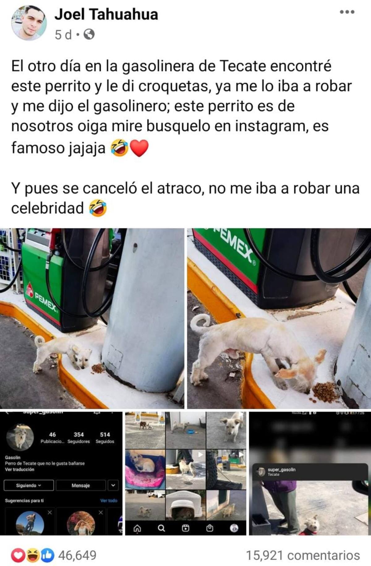 La fama de Gasolin llegó cuando un usuario de Facebook compartió su graciosa historia con el perrito. Se trata de Joel Tahuahua, quien explicó que vio al can en la gasolinera, por lo que decidió darle croquetas para después llevárselo a su casa.