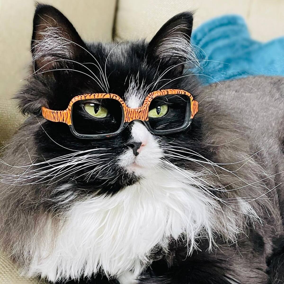 El gato es capaz de elegir su propia montura entre varias opciones, agradecer e incluso chocar los cinco como señal de que llevar gafas no tiene nada de negativo, mientras distrae a los más pequeños con su compañía.