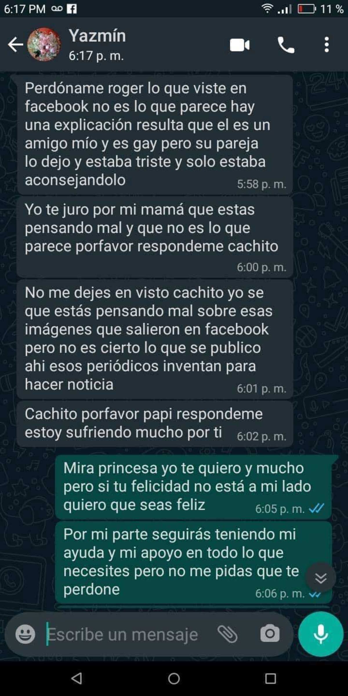 De acuerdo con lo que se pudo leer en unas capturas de WhatsApp que se viralizaron en Facebook, Roger se enteró que Yazmín le había puesto los “cuernotes” gracias a una foto que les tomó un reportero de un periódico y se difundió en Internet.