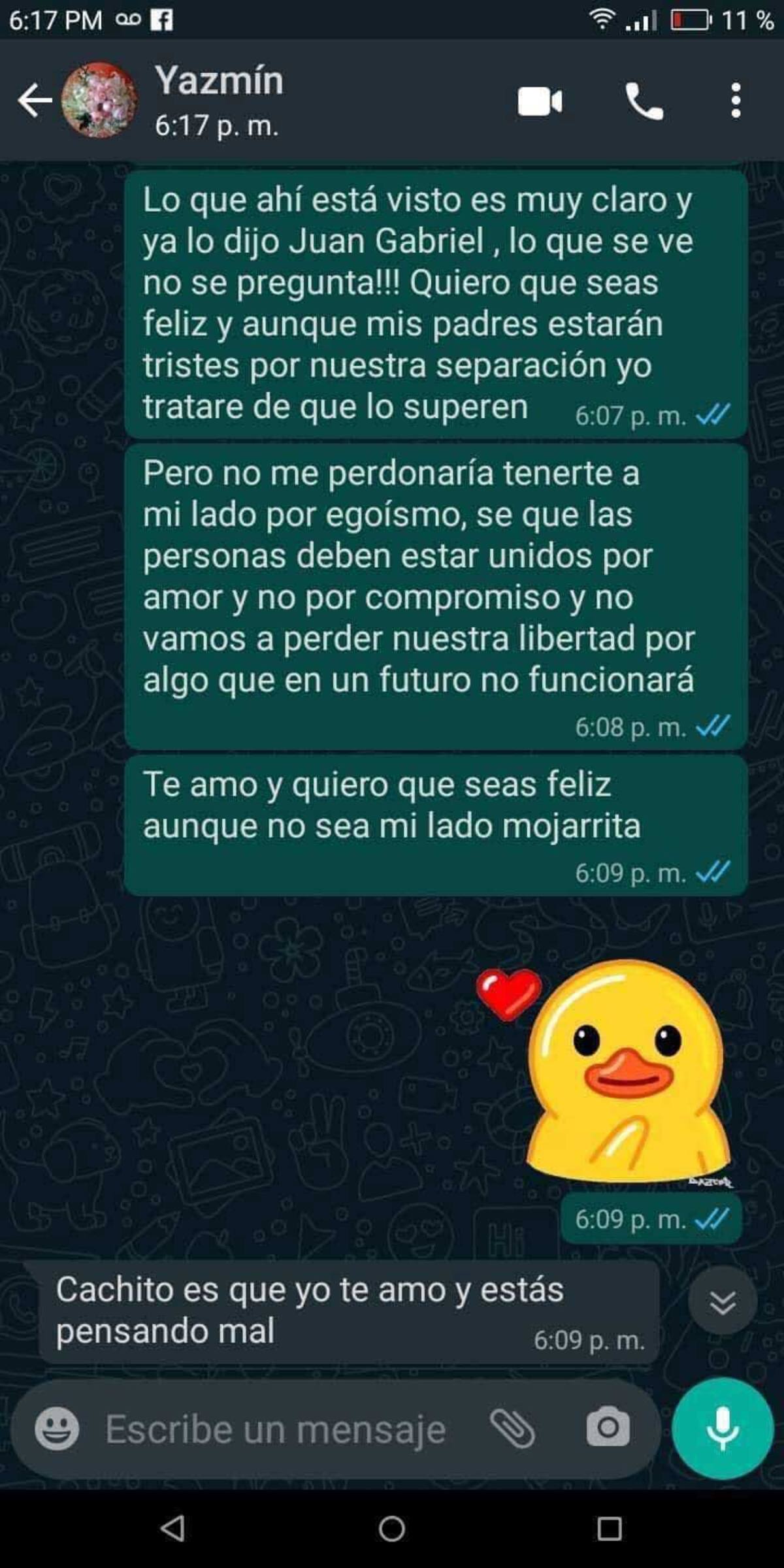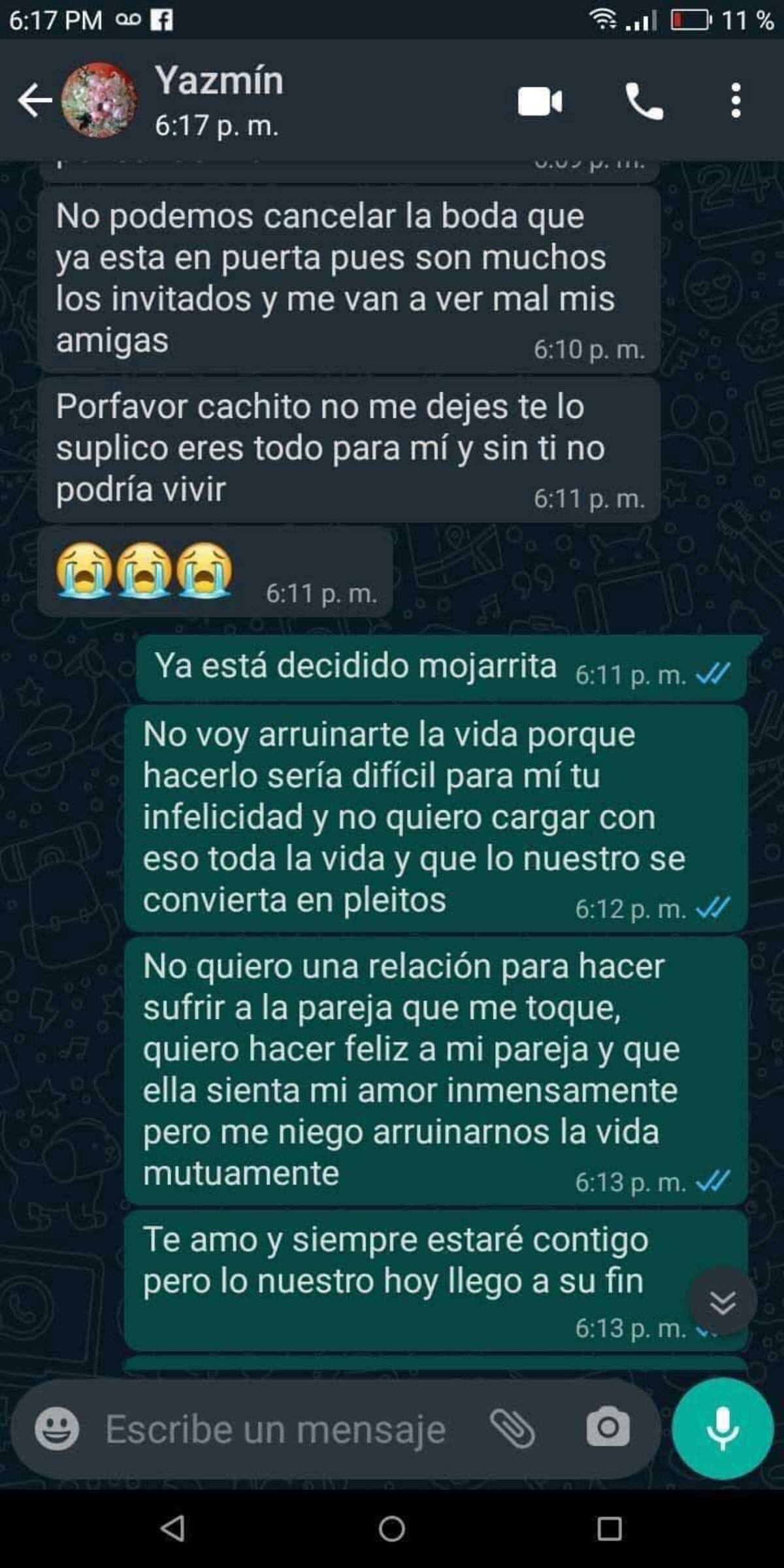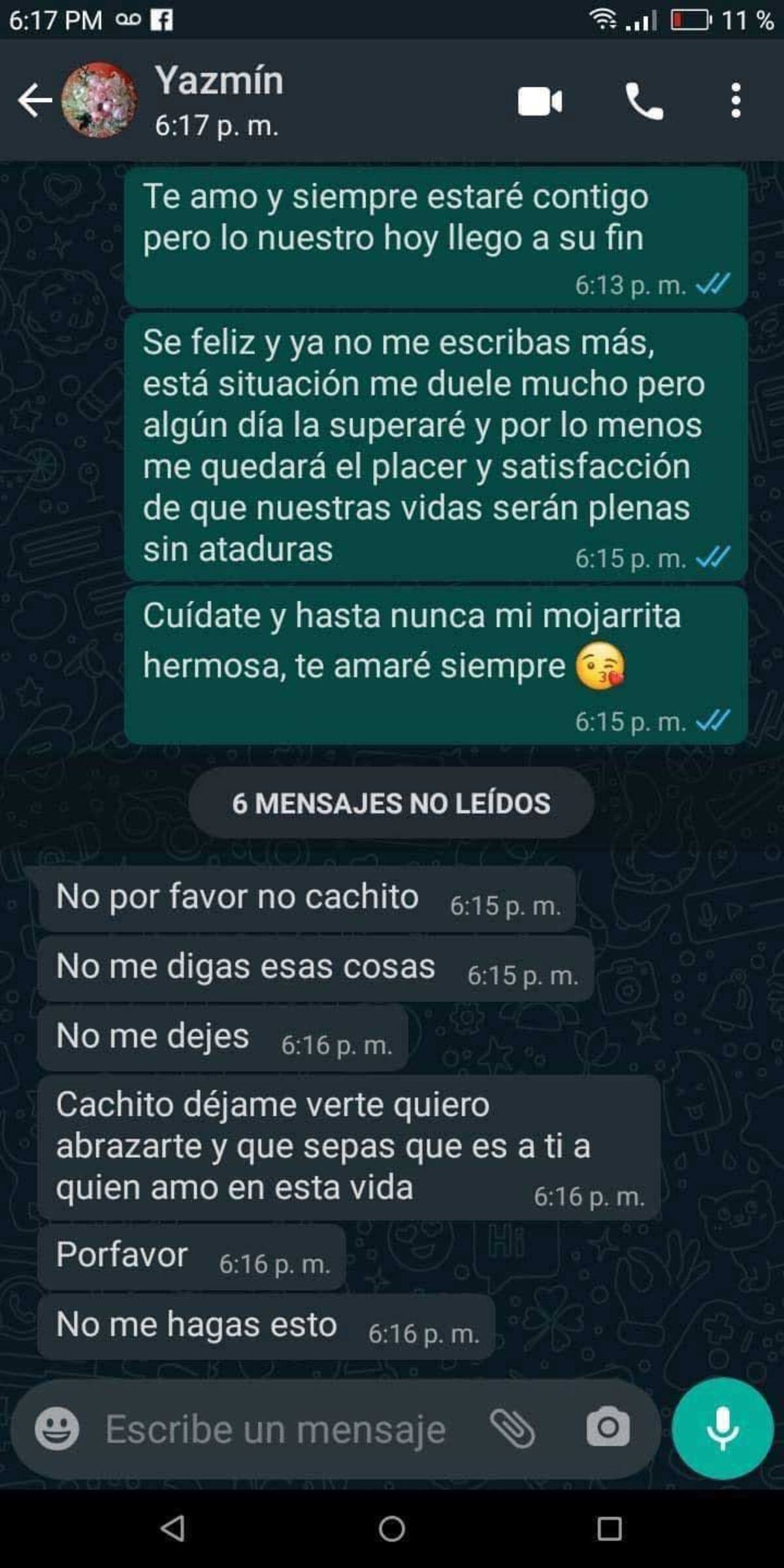 Ante la insistencia de Yazmín, “Cachito”, como le dice de cariño a su enamorado, le responde, pero le dice que su relación ya no puede continuar.