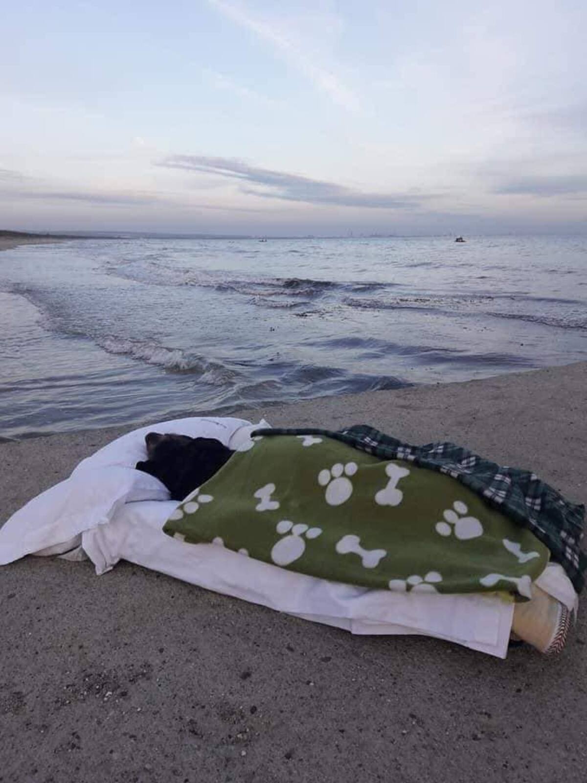 En las fotografías se observa a la lomita acostada en la orilla del mar, mientras recarga su cabeza en una almohada y esta tapada con cobijas.