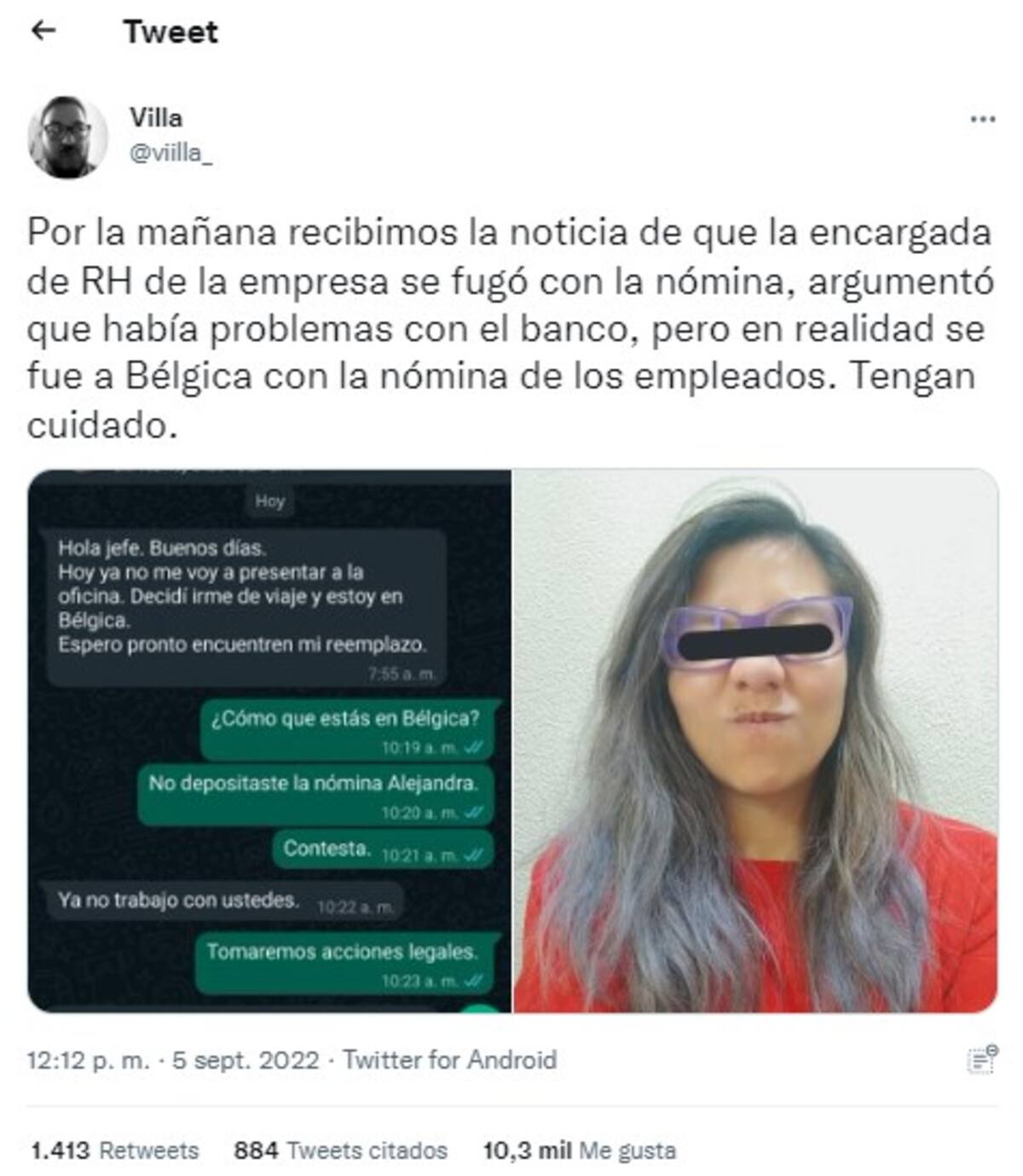 Ante esto, el “jefe” que tiene como nombre de usuario Villa publicó en Twitter: “Por la mañana recibimos la noticia de que la encargada de RH de la empresa se fugó con la nómina, argumentó que había problemas con el banco, pero en realidad se fue a Bélgica con la nómina de los empleados. Tengan cuidado”.