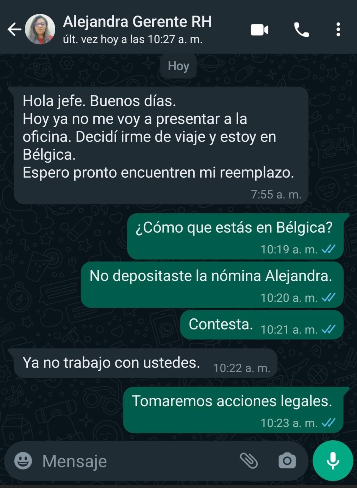 Hola jefe, buenos días. Hoy no me voy a presentar a la oficina, decidí irme de viaje y estoy en Bélgica. Espero pronto encuentres mi reemplazo”, escribió la "gerenta" en un mensaje de WhastApp.