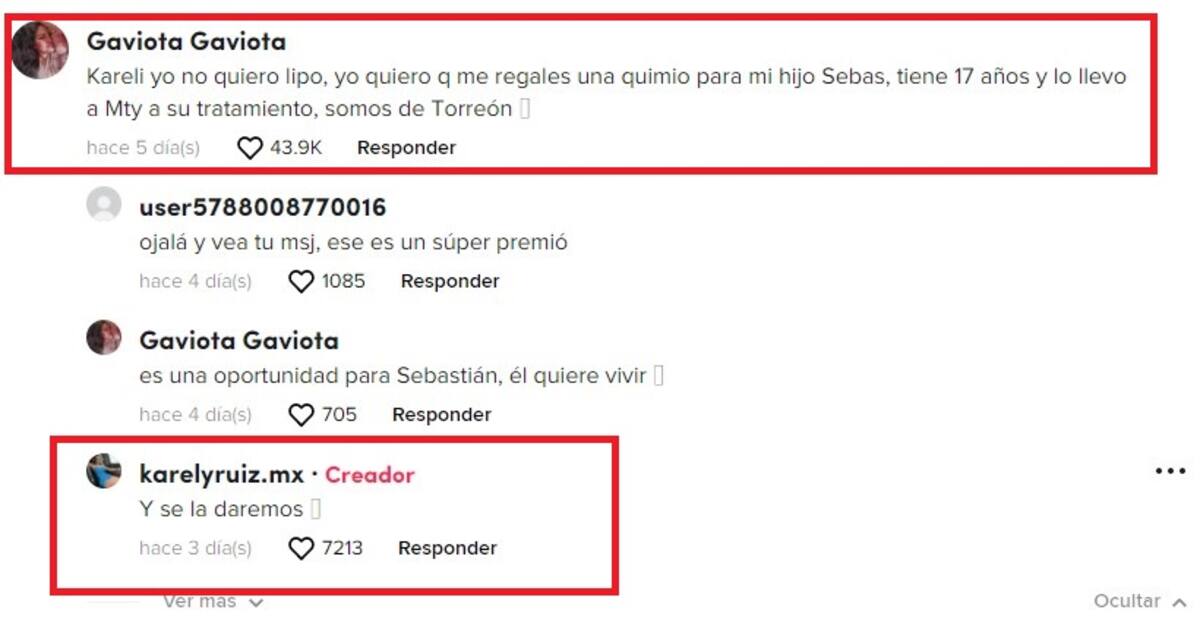 Karely yo no quiero lipo, quiero que me regales una quimio para mi hijo Sebas, tiene 17 años, y lo llevo a Monterrey a su tratamiento, somos de Torreón”, le escribió la señora.