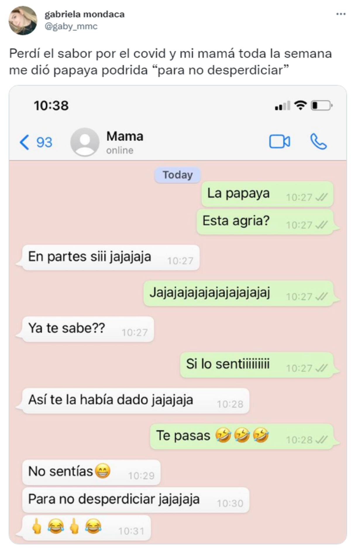 Perdí el sabor por el covid y mi mamá toda la semana me dió papaya podrida ‘para no desperdiciar’ [sic]”, escribió en Twitter.
