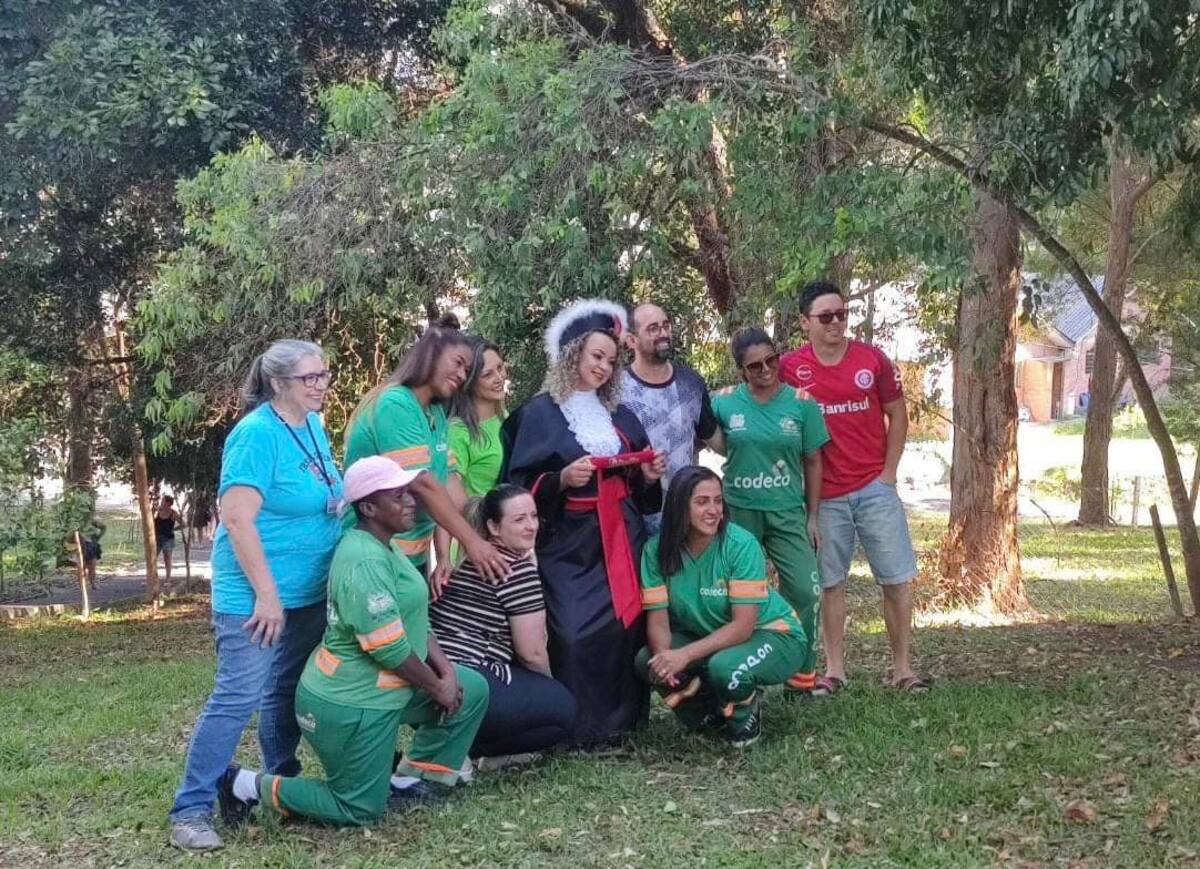 La historia compartida en la cuenta de Facebook de la empresa Codeca de la localidad de Caixas du Sul muestra las fotos de Lindiane Godoi, de 38 años, una madre soltera recolectora de basura, que posa con su toga y birrete junto a un camión de basura y sus compañeros de limpieza.