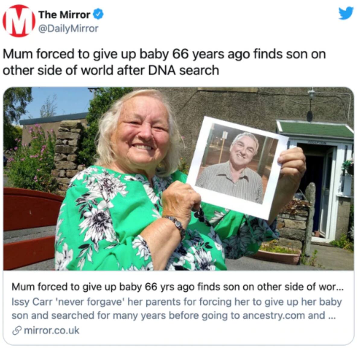 Issy, de Bentham, North Yorks, dio a luz en un hogar de ancianos en junio de 1955, a los 20 años, fue obligada a dar al bebé en adopción e incluso una enfermera no la dejó ni abrazarlo.