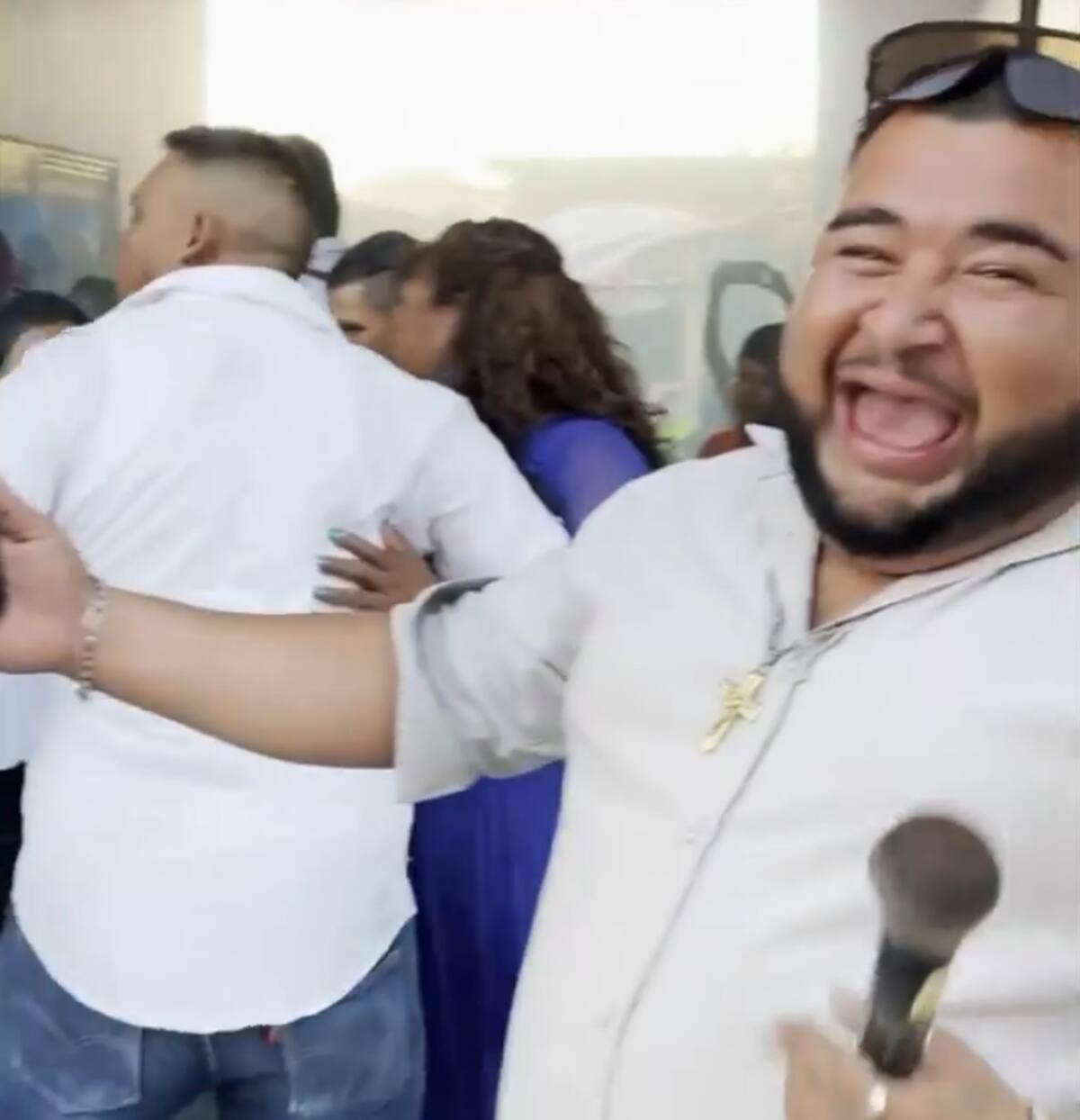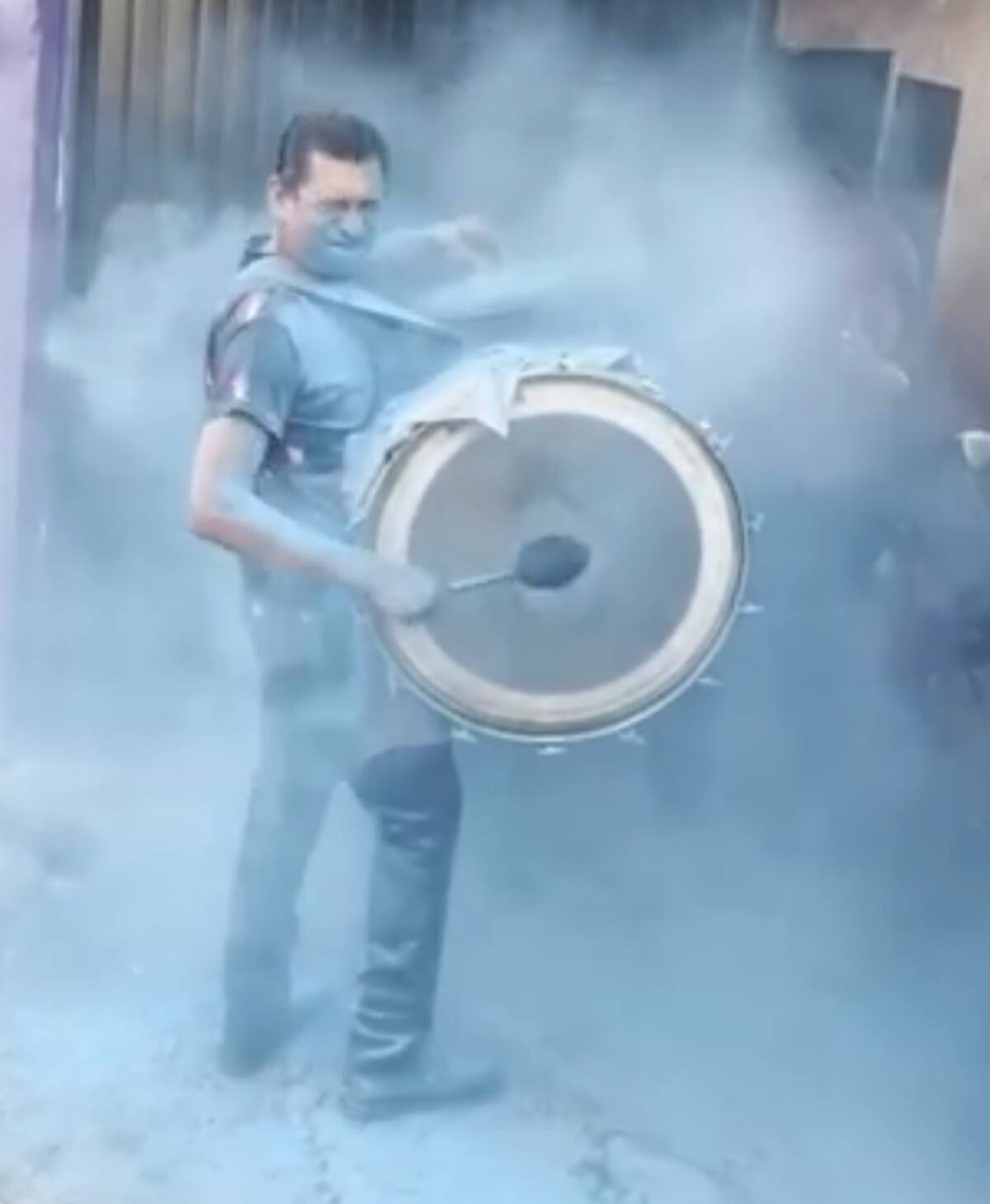Pero causó más sorpresa que el tamborero terminó todo pintado de color azul por el polvo que se encontraba en el platillo de la tambora, causando el ahogamiento de invitados y de los demás integrantes de la banda.